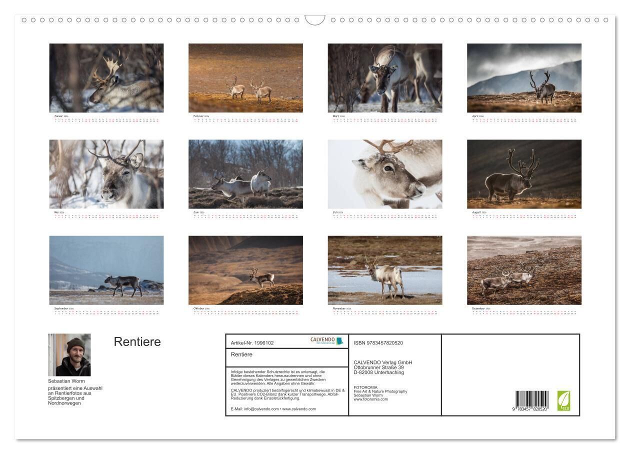 Sebastian Worm präsentiert eine Auswahl an Rentierfotos aus Spitzbergen und dem Norden Norwegens. Auf 12 Kalenderblättern wird die Tierart in verschiedenen Landschaften und zu unterschiedlichen Jahreszeiten porträtiert.