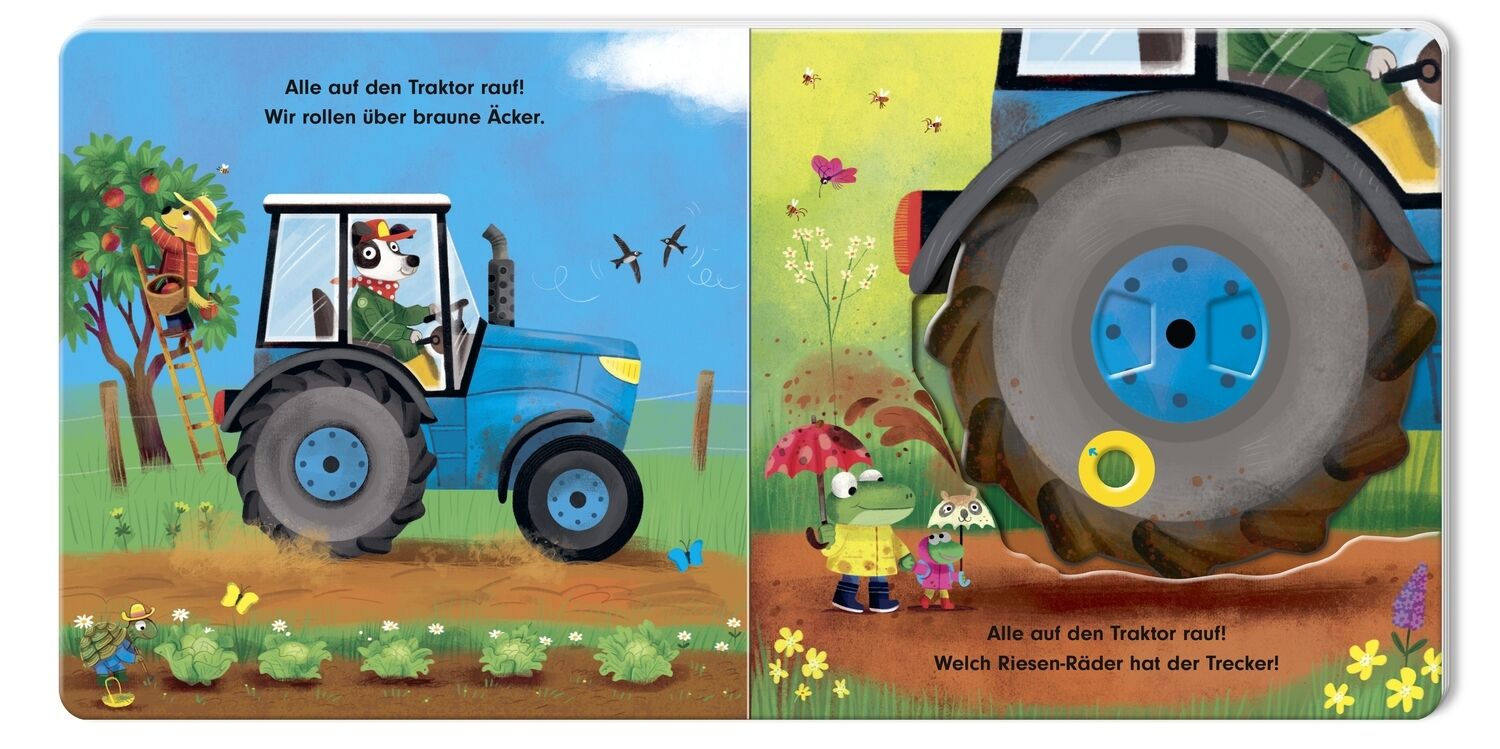 Alle auf den Traktor rauf! Heut sehn wir uns beim Bauern um! Auf dem Traktor zu fahren, macht großen Spaß! Dieses stabile Pappbilderbuch mit Schiebern und Drehrädern macht das Lieblingsthema Fahrzeuge interaktiv erlebbar. Schon kleinste Kinderhände können mithelfen, über den Bauernhof zu tuckern, die riesengroßen Räder zu drehen oder den Anhänger zu beladen.