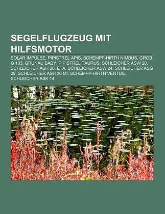 Quelle: Wikipedia. Seiten: 24. Kapitel: Solar Impulse, Pipistrel Apis, Schempp-Hirth Nimbus, Grob G 103, Grunau Baby, Pipistrel Taurus, Schleicher ASW 20, Schleicher ASH 26, ETA, Schleicher ASW 24, Schleicher ASG 29, Schleicher ASH 30 Mi, Schempp-Hirth Ventus,...Quelle: Wikipedia. Seiten: 24. Kapitel: Solar Impulse, Pipistrel Apis, Schempp-Hirth Nimbus, Grob G 103, Grunau Baby, Pipistrel Taurus, Schleicher ASW 20, Schleicher ASH 26, ETA, Schleicher ASW 24, Schleicher ASG 29, Schleicher ASH 30 Mi, Schempp-Hirth Ventus, Schleicher ASK 14, Stemme S 10, Rolladen Schneider LS10, Rolladen Schneider LS8, Schleicher ASH 31 Mi, E-Genius, Schleicher ASH 25, Icaré II, DG-1000, DG-800, Schleicher ASW 22, Lange Antares 20E, Schleicher ASW 28, DG-500, Technoflug Piccolo, Scheibe SF 27, Schempp-Hirth Arcus, Schempp-Hirth Discus, DG-400, Landmann L 17, Lange Antares 18S/T, Schempp-Hirth Janus, Binder EB 29, Rolladen Schneider LS9. Auszug: ist ein Projekt der Schweizer Bertrand Piccard und André Borschberg. Mit einem speziell dafür gebauten Solarflugzeug möchten sie 2012 eine Erdumrundung in mehreren Etappen schaffen. Ziel des Projekts ist es, eine Kommunikationsplattform für neue technische, ökologische und ökonomische Wissenschaften zu errichten. Die Erlangung eines Weltrekordes ist ausdrücklich nicht im Fokus. Das Ziel, umweltschonende Motorflugzeuge ohne Verbrauch von Brennstoff nach der Produktionsphase zu konstruieren, entstand, nachdem Piccard eine Nonstop-Weltumrundung im Heißluftballon Breitling Orbiter III im Jahr 1999 zwar erfolgreich, aber sehr knapp vollendete, da von den 3,7 Tonnen Propangas, die beim Start geladen waren, bei der Landung lediglich 40 Kilo verblieben waren. Der Prototyp des Flugzeugs ist mit einer Spannweite von 64 Metern bei einem Gewicht von lediglich 1,6 Tonnen 2009 fertiggestellt worden. Die gesamte Fläche der Flügeloberseite (etwa 200 m²) ist dabei mit rund 12.000 Solarzellen bestückt. Die Konstruktion und der Bau des zweiten Flugzeuges, mit dem die eigentliche Erdumrundung stattfinden soll, soll voraussichtlich noch 2011 beginnen. In seinen öffentlichen Auftritten betont Bertrand Piccard immer wieder die visionären Ambitionen des Projekts: die Neuorientierung des Lebensstils der industrialisierten Gesellschaft, die unverantwortlich mit den natürlichen fossilen Ressourcen des Planeten umgeht. Er möchte aufzeigen, dass eine verantwortliche, nachhaltige Energiewende möglich und zwingend notwendig ist. Es sei bereits mit heutiger Technik möglich, den Energieverbrauch mehr als zu halbieren. Das Projekt sei nicht nur als Flugzeug zu verstehen, sondern als wirtschaftliche, umweltpolitische und wissenschaftliche Botschaft und Symbol, berichtete er vor der französischen Nationalversammlung. Eine besondere Einsicht hatte Piccard nach der Landung der Non-Stop-Ballonfahrt rund um die Erde in Ägypten. Als er sah, dass von den 3,7 Tonnen Flüssiggas, welches der Ballon beim Start