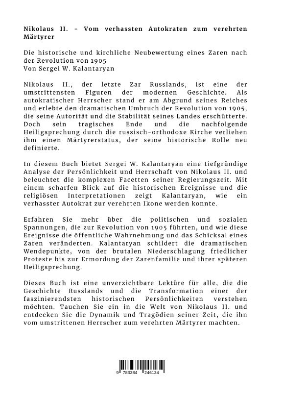 Nikolaus II. - Vom verhassten Autokraten zum verehrten Märtyrer Die historische und kirchliche Neubewertung eines Zaren nach der Revolution von 1905 Von Sergei W. Kalantaryan Nikolaus II., der letzte Zar Russlands, ist eine der umstrittensten Figuren der moder...