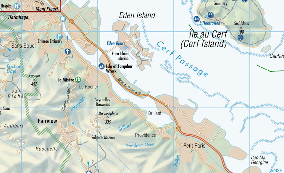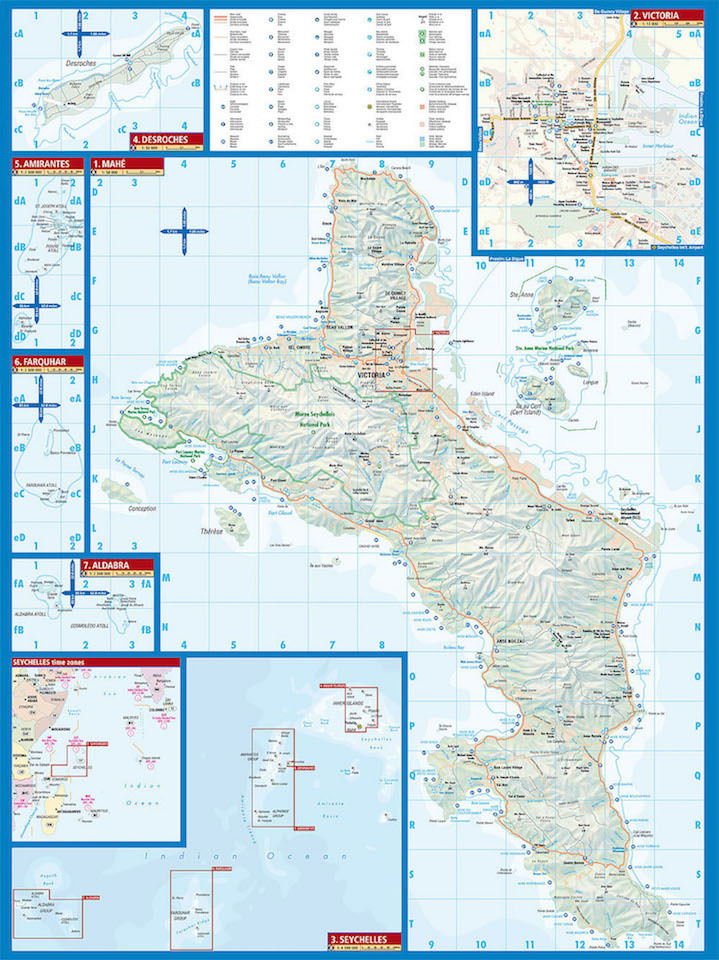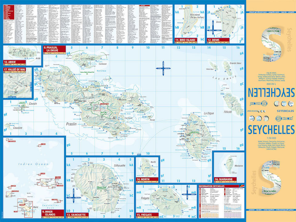 Our laminated and folded Borch Map of the Seychelles in the 6th edition contains: Bird Island, Denis, Arid, Fregate 1:25 000, Mahe, Silhouette, Praislin, La Digue, Marianne, Desroches, North 1:50 000, Inner Islands 1:750 000, Seychelles 1:4 500 000, Victoria 1...