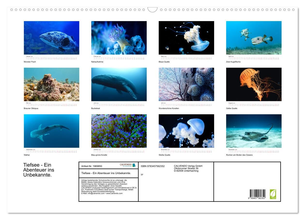 Die Tiefsee ist sogleich beunruhigend und faszinierend zugleich. Es ist eines der Gebiete die es auf unserem Planeten noch zu entdecken gibt, da wir Menschen noch relativ wenig über die Tiefsee und seine Bewohner wissen. Dieser Kalender zeigt 12 faszinierende ...
