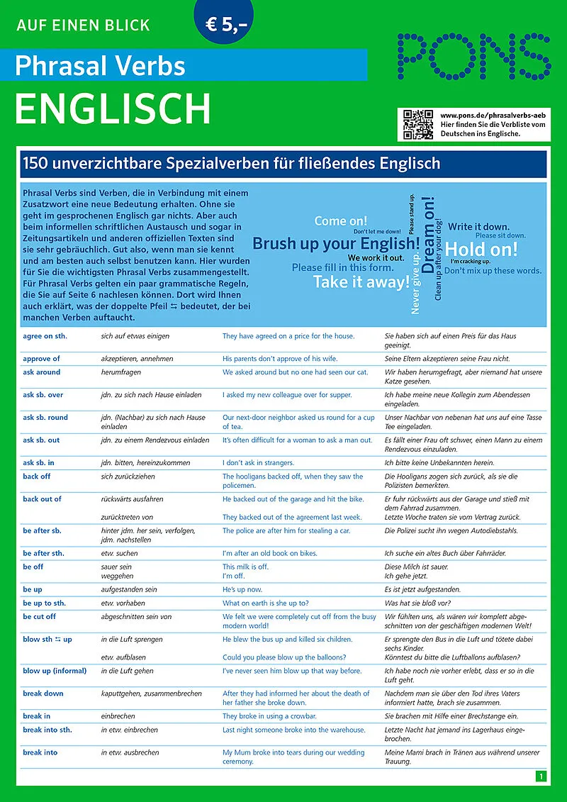 Der praktische Spickzettel: Brush up your English - ohne Phrasal Verbs geht nichts im Englischen! Mit diesem praktischen Helfer finden Sie im Nu die 150 wichtigsten Phrasal Verbs mit Übersetzung und Beispielen für fließendes Englisch. Inklusive Erklärung der ...