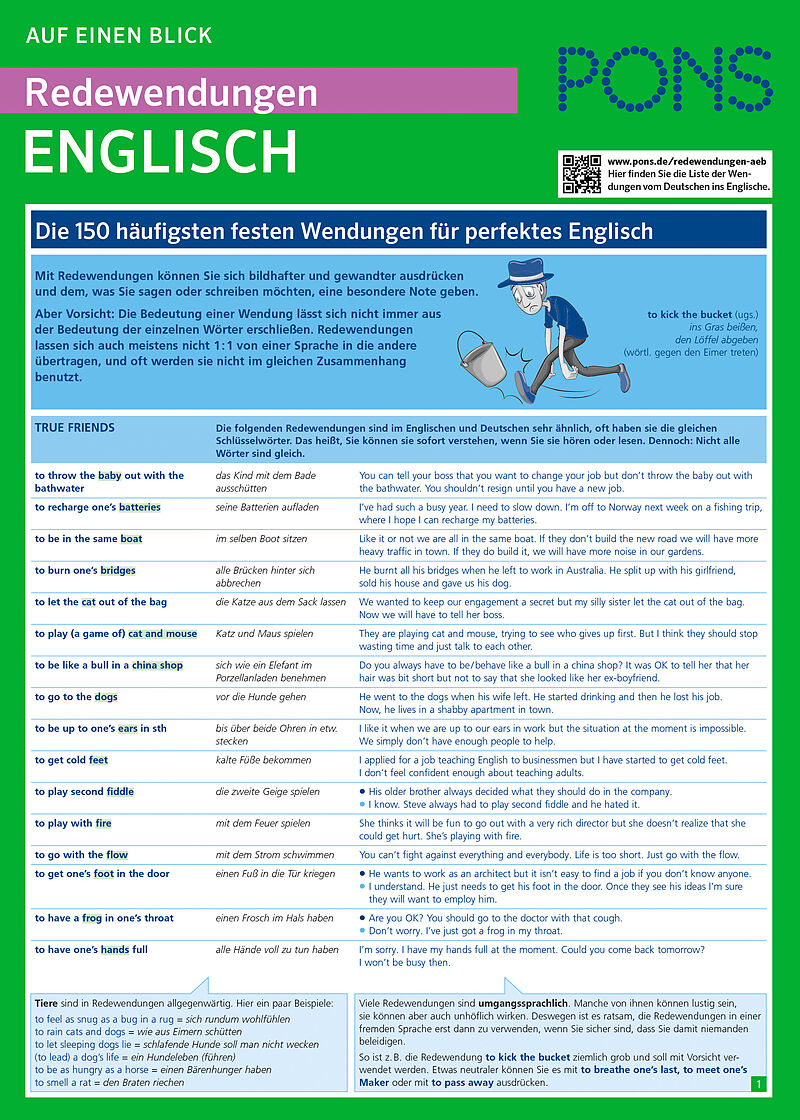 Die kompakte Übersicht zu englischen Redewendungen: Die 150 wichtigsten Redewendungen mit Übersetzung und Beispielen für authentisches Englisch . Inklusive Tipps und Hinweisen zu Herkunft, Gebrauch und Besonderheiten. Immer griffbereit: Liste mit Redewendunge...