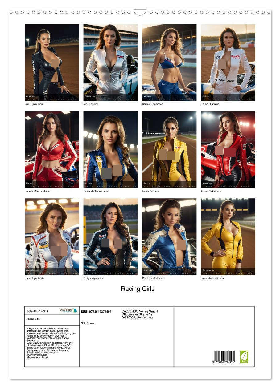 KI generierte Bilder. Erotik. Erleben Sie ein Jahr voller Adrenalin und Stil mit unserem exklusiven Bildkalender. Jeder Monat präsentiert eine beeindruckende Dame in einem maßgeschneiderten Auto Racing-Anzug mit tiefem Ausschnitt, die die Welt des Motorsports ...