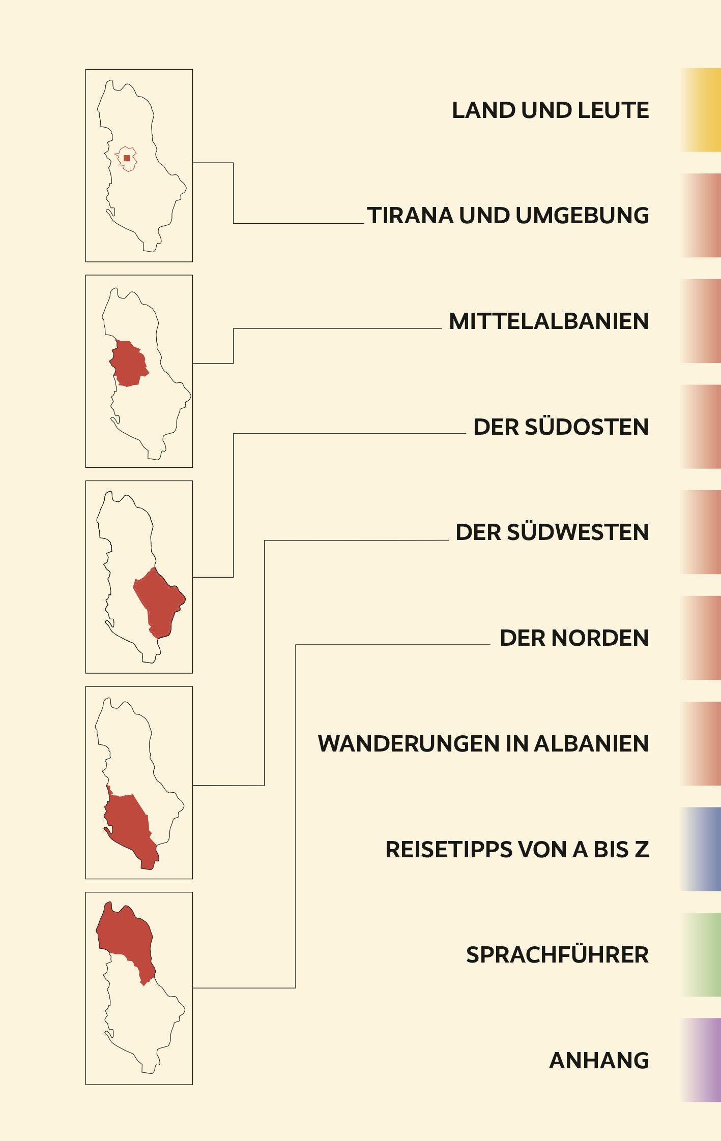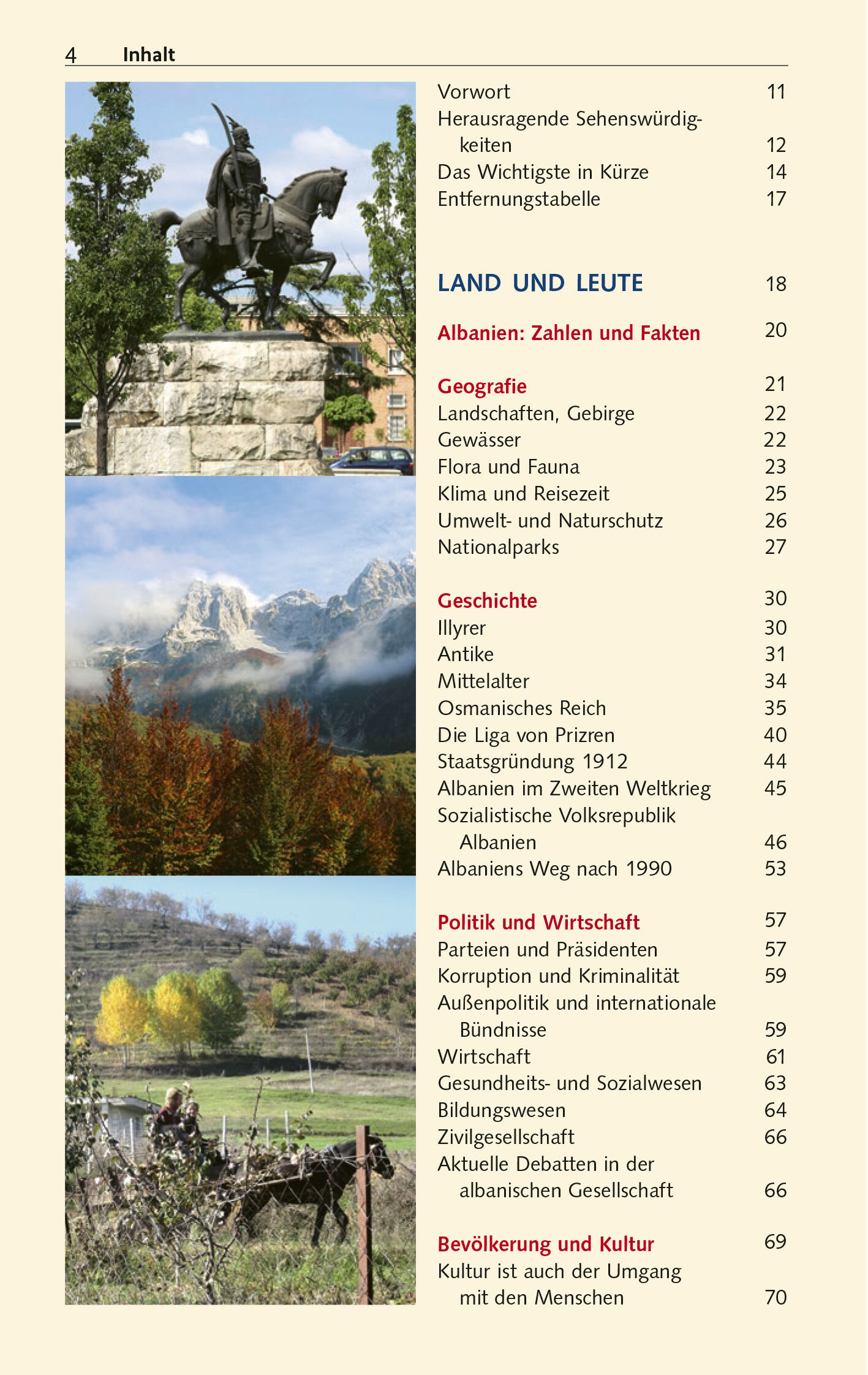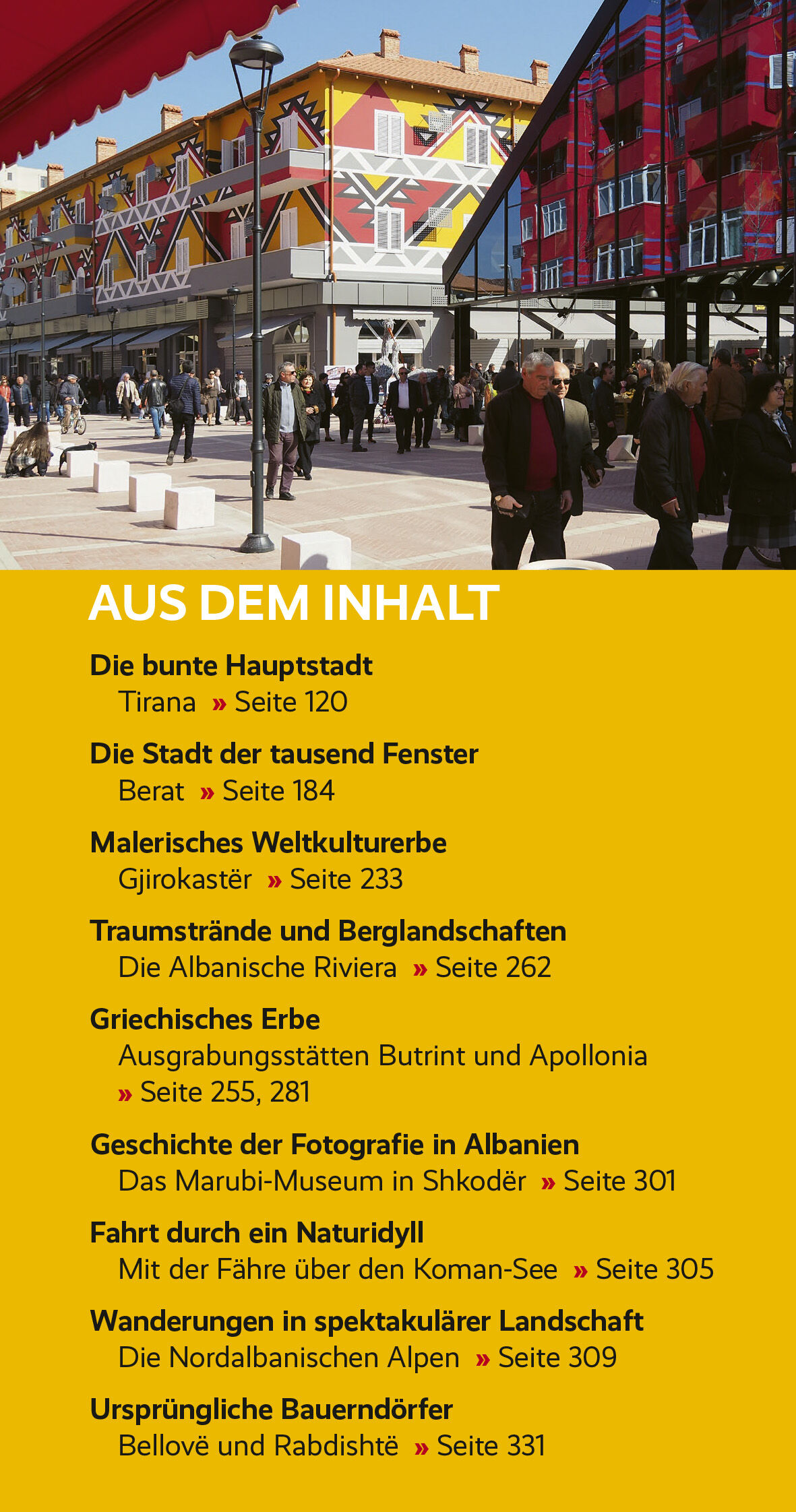 Der in Tirana gebürtige Autor und Reiseleiter Shkëlzen Alite kennt jeden Winkel im Land. In diesem Reiseführer gibt er tiefen Einblick in Albaniens Naturschönheiten, die Landesgeschichte, seine Traditionen und Lebensart und macht mit allen Sehenswürdigkeiten ausführlich bekannt. Von der Antike bis zur kommunistischen Ära hat jede Epoche ihre Spuren hinterlassen. Festungen und Burgruinen zeugen von der illyrischen, römischen, byzantinischen und osmanischen Vergangenheit. Ausgrabungsstätten wie Apollonia und Butrint zählen zum UNESCO-Welterbe. Ebenso die Städtchen Berat und Gjirokastër, die mit Häusern in typischer Balkanarchitektur, Kirchen, Moscheen und einer Burg steil auf dem Berghang bezaubern. Die Hauptstadt Tirana erfreut mit lebhaft-buntem Metropolen-Flair.