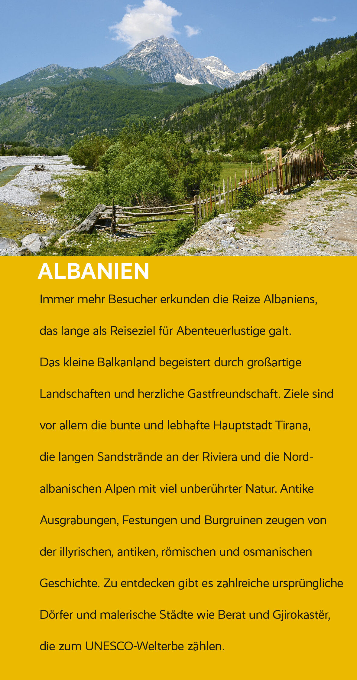 Schroffe Zinnen, Gletscherseen und tiefe Schluchten prägen die Albanischen Alpen. Wandern und Trekking, beispielsweise im Valbona-Nationalpark oder auf dem grenzübergreifenden Trail Peaks of the Balkans im Dreiländereck Albanien-Kosovo-Montenegro, zählt zu den spektakulären Höhepunkten. Im Ceraunischen Küstengebirge im südlichen Llogara-Nationalpark lassen sich, bei hinreißender Sicht auf das Ionische Meer, Wandern, Baden und Wassersport kombinieren. Herrliche Strände warten an der Albanischen Riviera auf Sonnenanbeter, zum Beispiel in Ksamil, der "Karibik Albaniens".