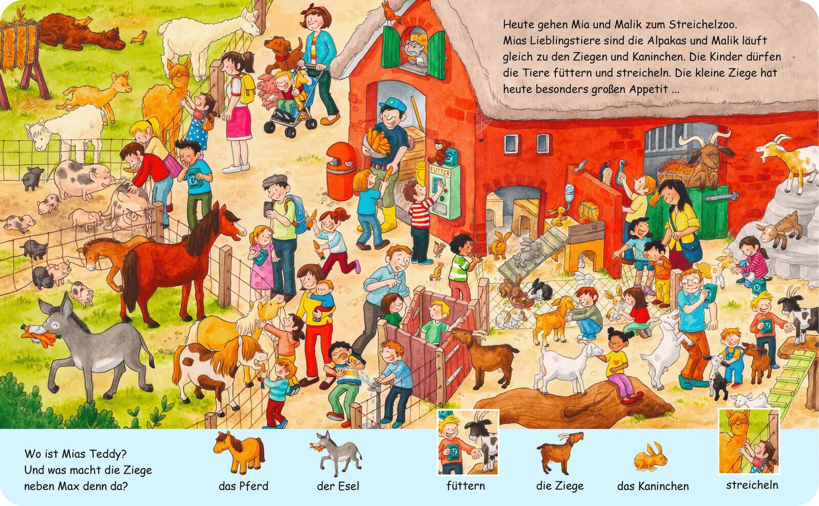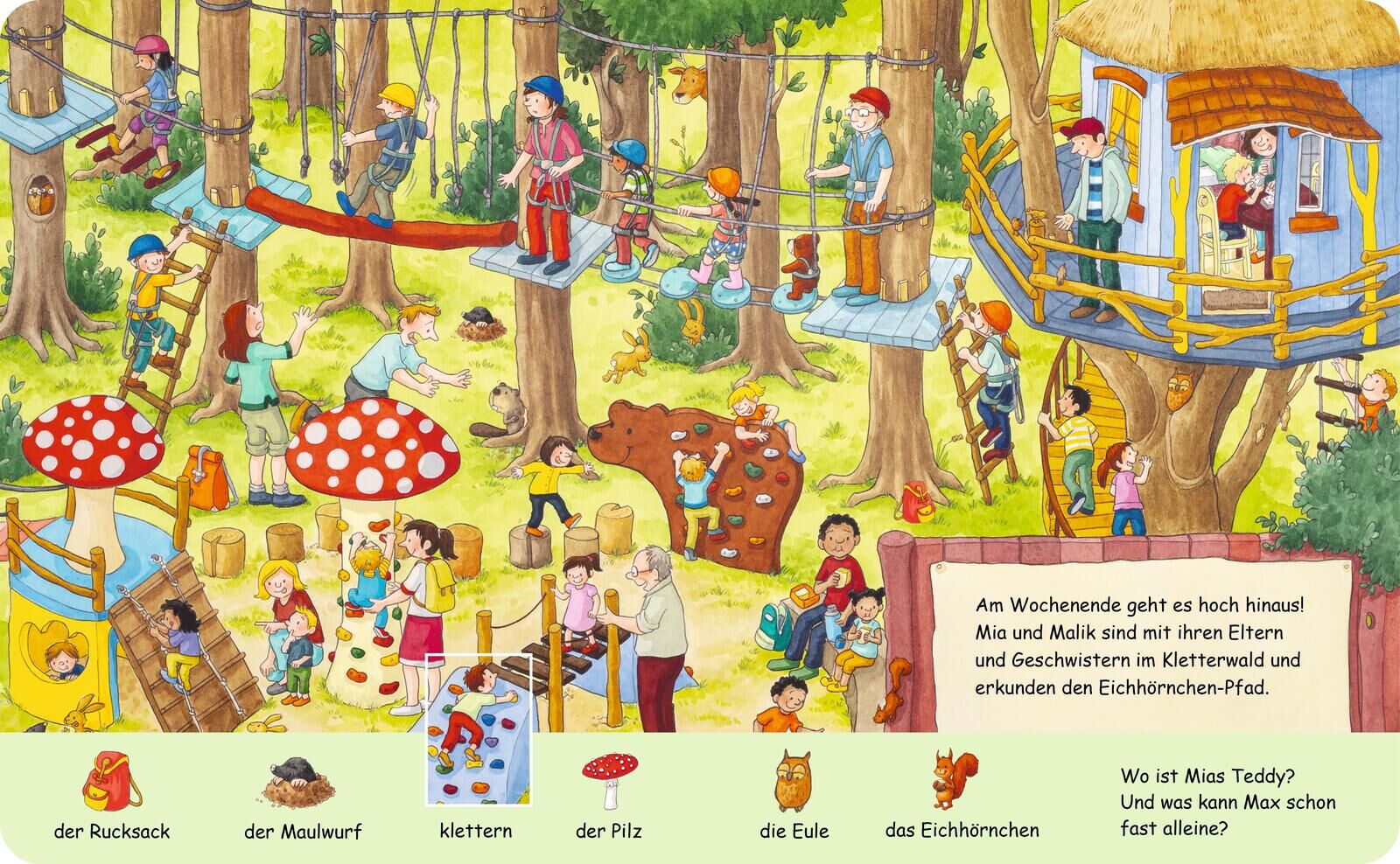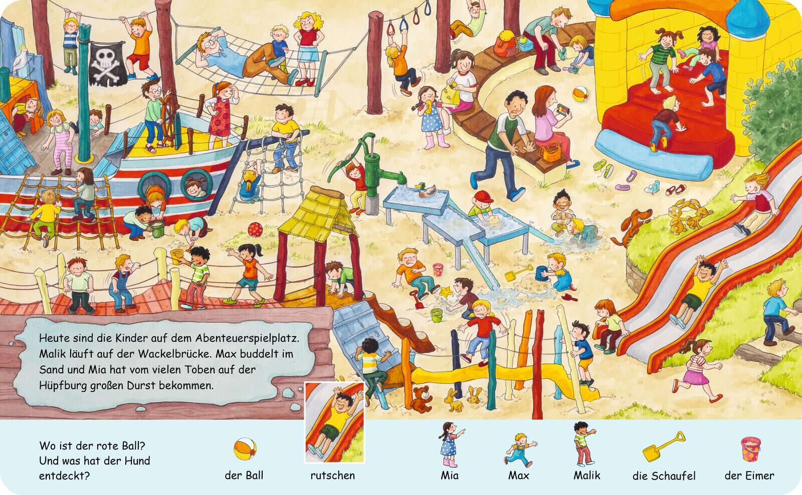 Wimmelbuch und Wörterbuch in Einem! Das Bildwörter-Wimmelbuch ist praktisch gegliedert nach verschiedenen Themenbereichen aus dem Kinderalltag wie Stadt, Einkaufen, Spielplatz, Kindergarten, Streichelzoo, Abenteuer- und Kletterpark. Auf insgesamt 7 Doppelseit...