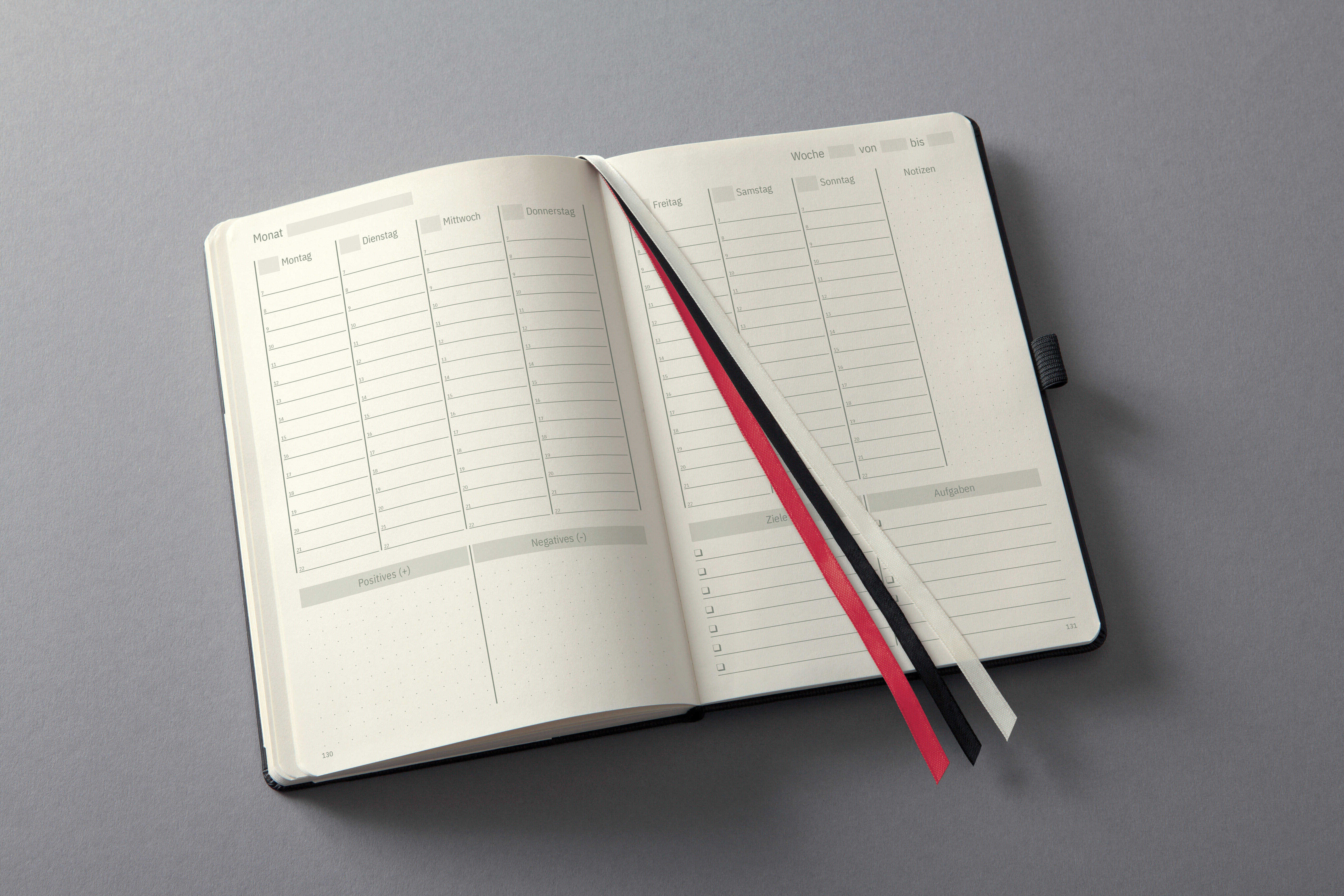 Immer stilsicher organisiert - mit dem eleganten undatierten Wochenplaner Conceptum (Kalendarium: 2 Seiten = 1 Woche, DE) im Format ca. A5 (14,80 x 21,30 x 2 cm) mit 192 Seiten. Der stabile Hardcover-Einband in schwarz garantiert Stabilität beim Schreiben. Mit...