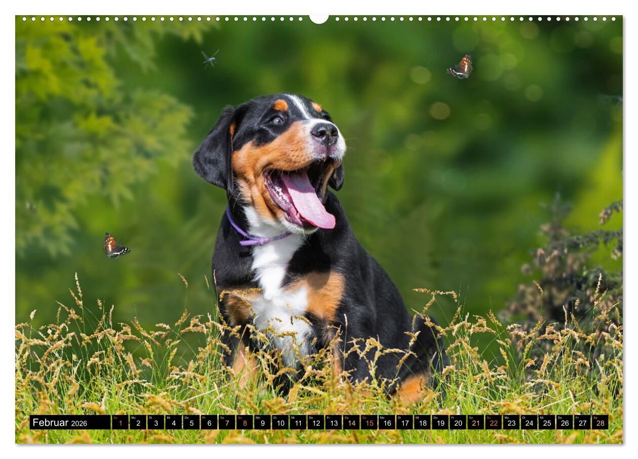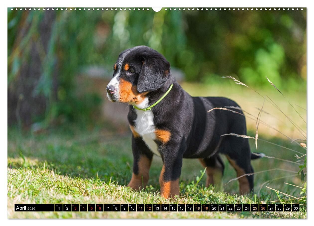 Großer Schweizer Sennenhund - Mit Schweizer Welpen durch das Jahr (hochwertiger Premium Wandkalender 2026 DIN A2 quer), Kunstdruck in Hochglanz
