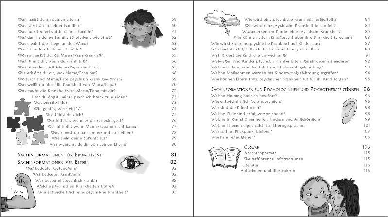 Hallo du! 6 Annikas andere Welt 7 Wenn Mama oder Papa seltsam werden: Informationen für dich! 17 Was ist die Psyche? 17 Was heißt psychisch krank'? 22 Woran ist eine psychische Krankheit erkennbar? 30 Weshalb wird die psychische Krankheit erst später bemerkt? 32 Weshalb wird die psychische Krankheit geheim gehalten? 32 Was verändert sich durch die psychische Krankheit? 34 Was bekümmert betroffene Kinder? 36 Was sollst du unbedingt wissen? 37 Wie kannst du mit der Krankheit klarkommen? 41 Was tut betroffenen Kindern gut? 42 Wie erklärst du anderen, was deine Mama/dein Papa hat? 43 Wie kann Mama/Papa geholfen werden? 43 Wie kann es weitergehen? 46 Mit-Mach-Seiten für Kinder 47 Wer bist du? 47 Kopfsalat Annikas Gefühle-und-Gedanken-Lied 48 Was kannst du gut? 50 Was hast du gut gemacht? 52 Was magst du an dir? 53 Was mag deine Familie an dir? 54 Was mögen deine Freunde an dir? 55 Was magst du an deinen Eltern? 56 Was ist schön in deiner Familie? 58 Was funktioniert gut in deiner Familie? 59 Was darf in deiner Familie so bleiben, wie es ist? 60 Was erzählt die Fliege an der Wand? 61 Was ist anders in deiner Familie? 62 Woran merkst du, ob Mama/Papa krank ist? 63 Was ist mit dir, wenn du krank bist? 64 Was ist anders, seit Mama/Papa krank ist? 65 Wie erklärst du dir, was Mama/Papa hat? 66 Wodurch ist Mama/Papa psychisch krank geworden? 67 Was weißt du über die Krankheit von Mama/Papa? 68 Was macht die Krankheit von Mama/Papa mit dir? 70 Hast du Angst, selber psychisch krank zu werden? 71 Was vermisst du? 71 Wie geht's, wie steht's? 72 Wie fühlst du dich? 73 Was hilft dir, wenn es dir schlecht geht? 74 Wer hilft dir, wenn Mama/Papa es nicht kann? 75 Was kannst du tun, um gesund zu bleiben? 76 Wie sieht deine Zukunft aus? 77 Was wünschst du dir von deinen Eltern? 78 Sachinformationen für Erwachsene 79 Sachinformationen für Eltern 80 Was bedeutet Gesundsein? 80 Was bedeutet Kranksein? 80 Was bedeutet psychisch krank'? 80 Welche psychischen Krankheiten gibt es? 80 Wie entwickelt sich eine psychische Krankheit? 81 Wie wird eine psychische Krankheit festgestellt? 82 Wie wird eine psychische Krankheit behandelt? 82 Woran erkennen Kinder eine psychische Krankheit? 83 Wie können Eltern kindgerech…
