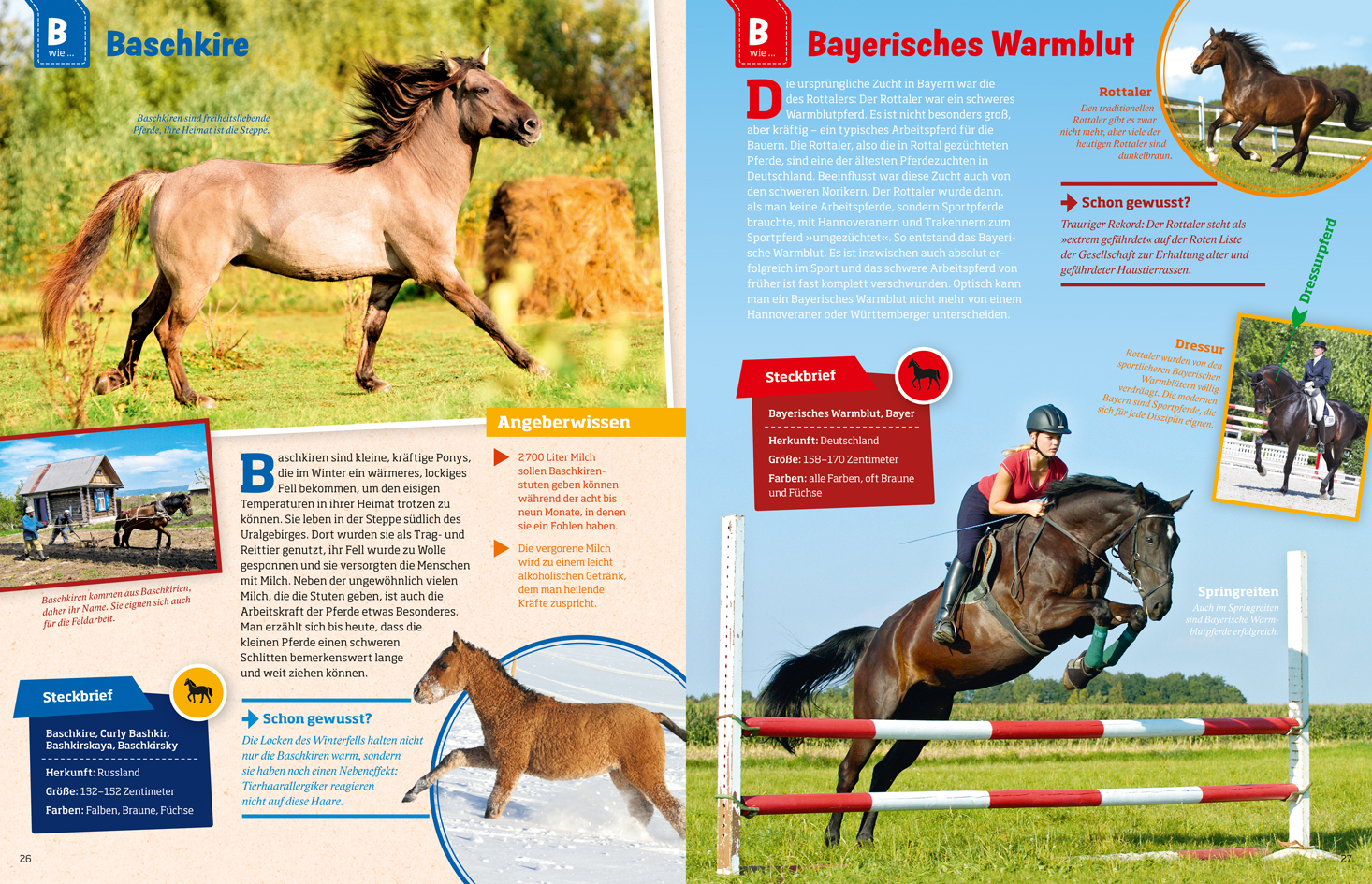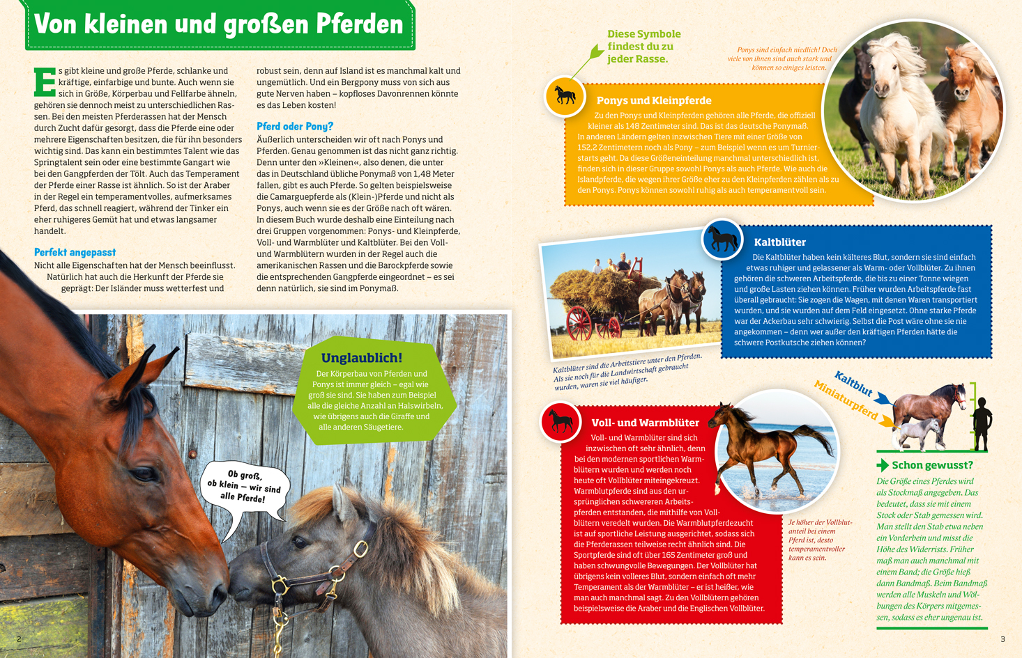 Wilde Mustangs galoppieren über die weiten Ebenen Nordamerikas. Kleine, aber robuste Islandpferde kämpfen sich tapfer durch die strengen Winter ihrer Heimat. Die Welt der Pferde und Ponys ist vielfältig! Ob Freizeitpferd wie Haflinger, blitzschnelle Araber ode...
