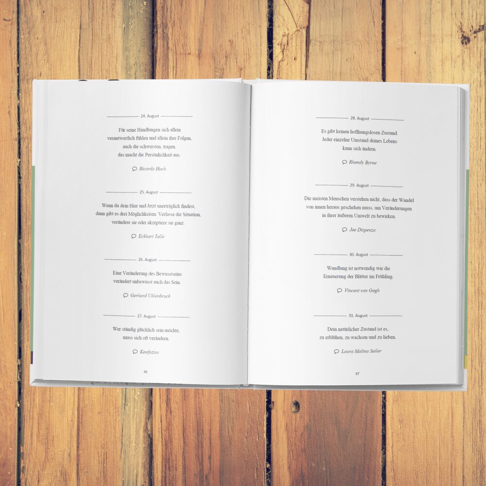 Zitate können dir die Augen öffnen und dafür sorgen, dass du auch in den alltäglichen Dingen dein Glück findest. Jedes Mal, wenn du einen Impuls brauchst, kannst du dieses Buch aufschlagen, ein paar Zeilen lesen und dein Mindset korrigieren. Es sind die kleinen Dinge, die deinen Alltag zu etwas Besonderem machen und wenn du es schaffst, diese kleinen Wunder selbstständig einzustreuen, wirst du ein glückliches und sinnerfülltes Leben führen.
