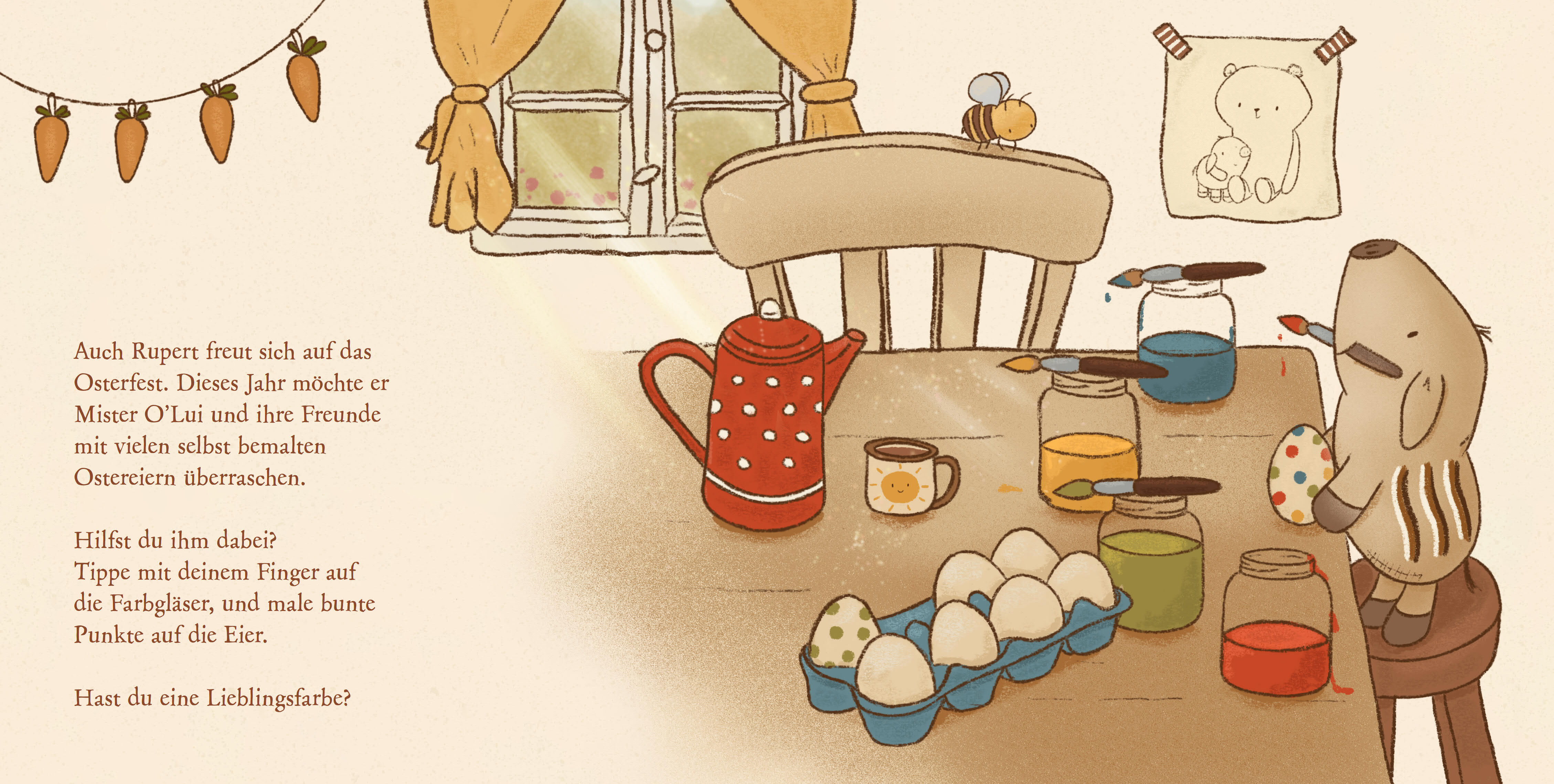 Bald ist Ostern, und Mister O'Lui freut sich schon auf das große Osterfrühstück mit all seinen Freunden. Natürlich ist sein bester Freund Rupert auch dabei. Das Streifenschwein möchte Mister O'Lui eine Freude bereiten und ihm viele bunte Ostereier schenken. D...