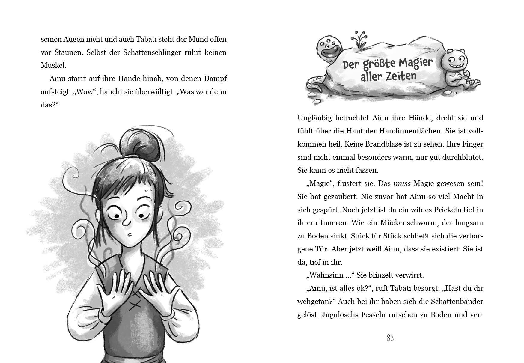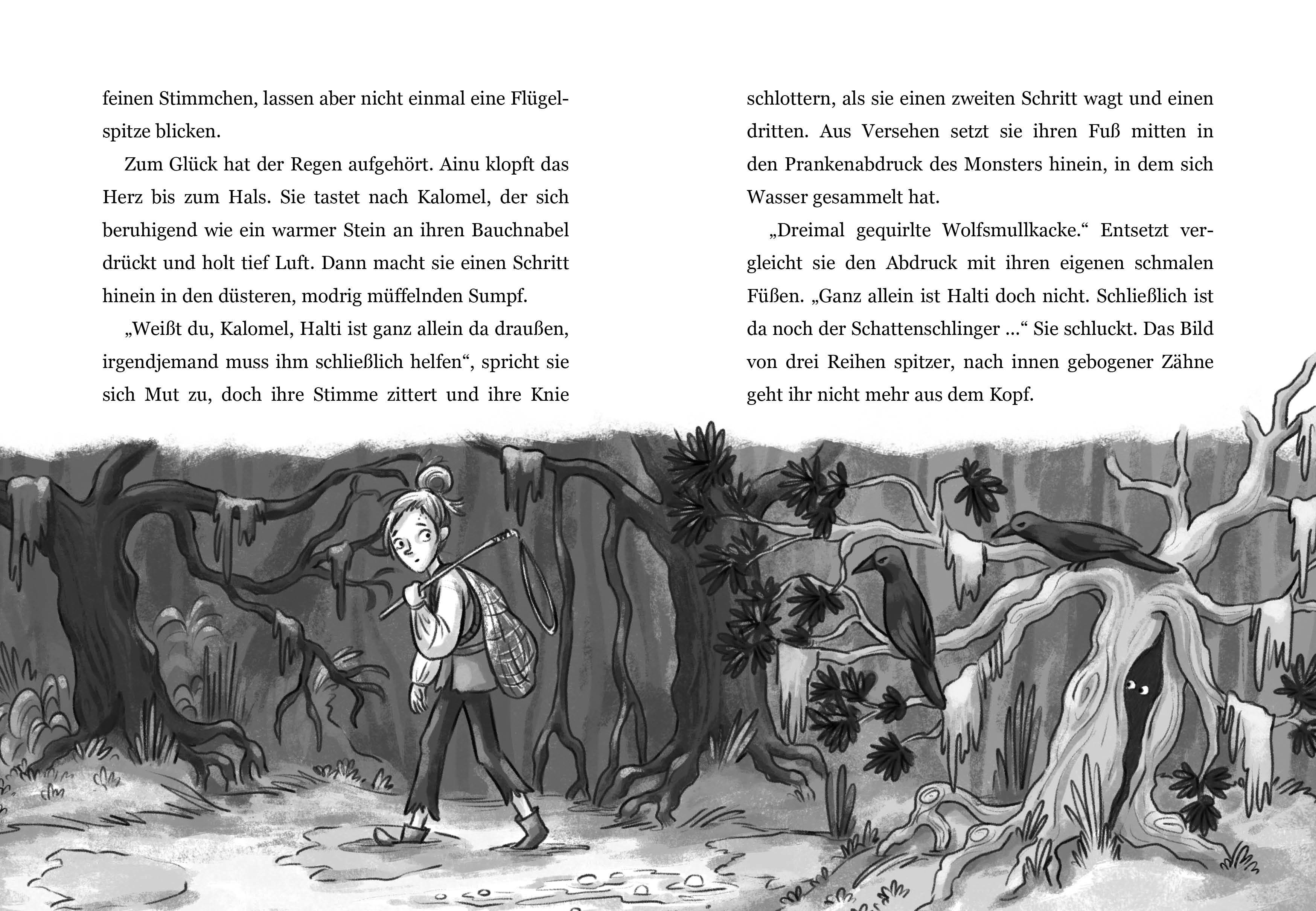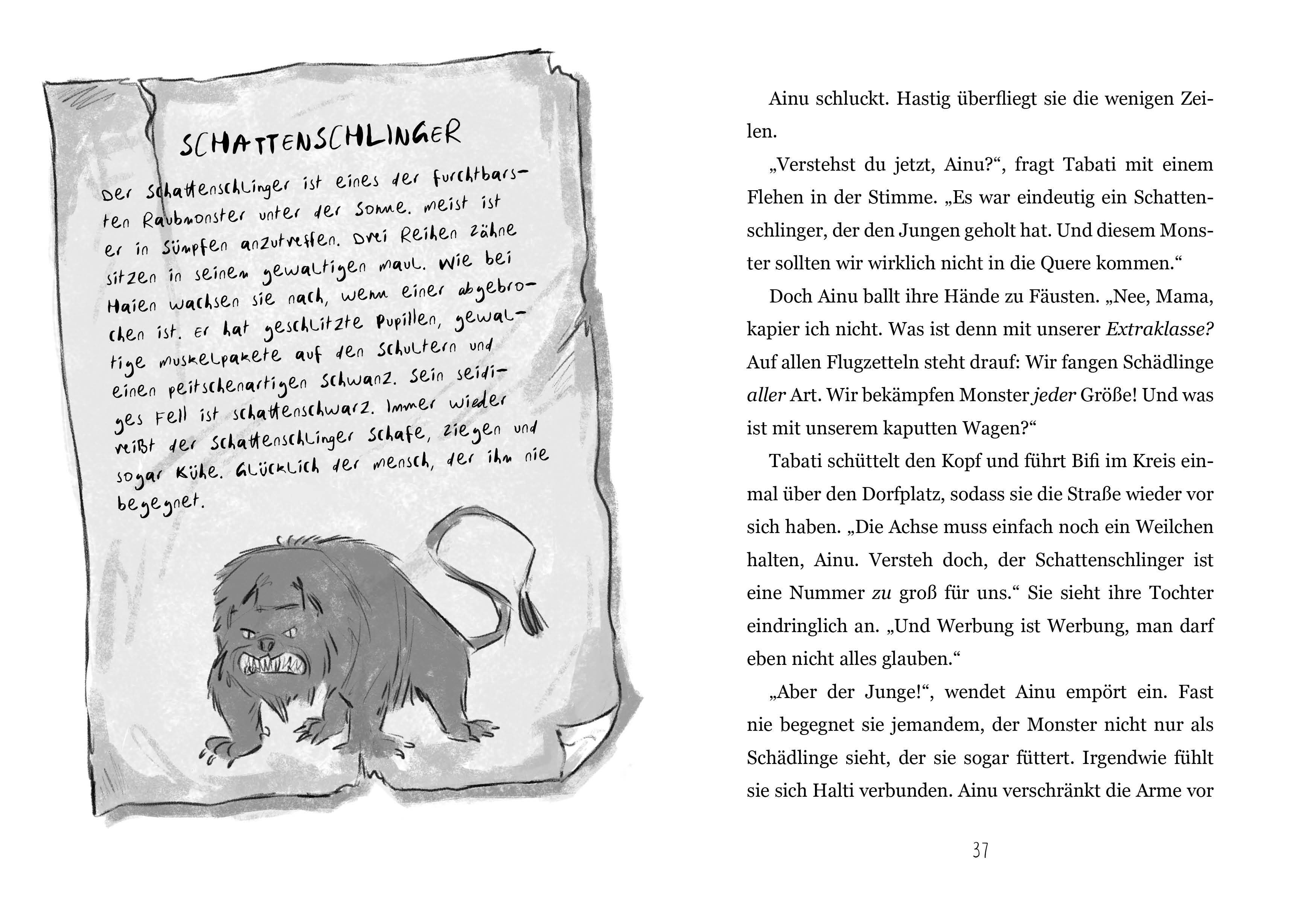 Die 8-jährige Ainu zieht mit ihrer Mutter Tabati und Pony Bifi von Dorf zu Dorf, wo die beiden ihre Dienste als Schädlingsbekämpferinnen und Monsterjägerinnen anbieten. Am liebsten würde Ainu jedes Monster, das sie fangen, auch behalten - sehr zum Ärger ihrer Mutter. Doch der nächste Auftrag erweist sich als besonders gefährlich: Ein Junge ist von einem unheimlichen Monster entführt worden - dem Schattenschlinger! Tabati will auf der Stelle kehrt machen, dieses Monster ist ihr eine Nummer zu groß. Aber sie hat die Rechnung ohne ihre furchtlose Tochter gemacht, die den Spuren des Monsters in die Gurgelsümpfe folgt, um den Jungen zu befreien ...