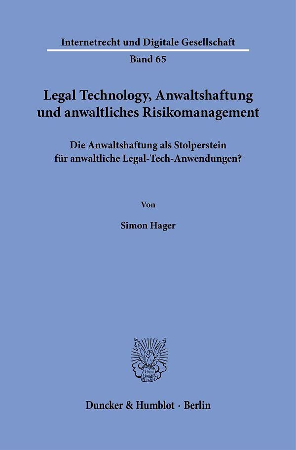 Die Arbeit gelangt zu dem Ergebnis, dass Legal Technology den Rechtsanwalt nicht verdrängen wird. Jedoch führt die Nutzung von Legal Technology und Künstlicher Intelligenz durch Rechtsanwälte zu neuen, bislang meist vernachlässigten Fragen der anwaltlichen Ber...