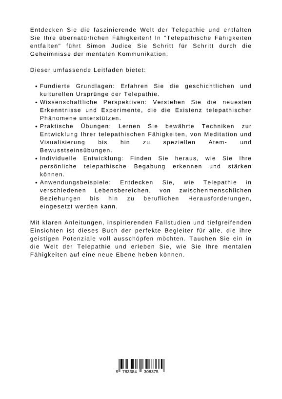 ntdecken Sie die faszinierende Welt der Telepathie und entfalten Sie Ihre übernatürlichen Fähigkeiten! In "Telepathische Fähigkeiten entfalten" führt Simon Judice Sie Schritt für Schritt durch die Geheimnisse der mentalen Kommunikation. Dieser umfassende Leitf...