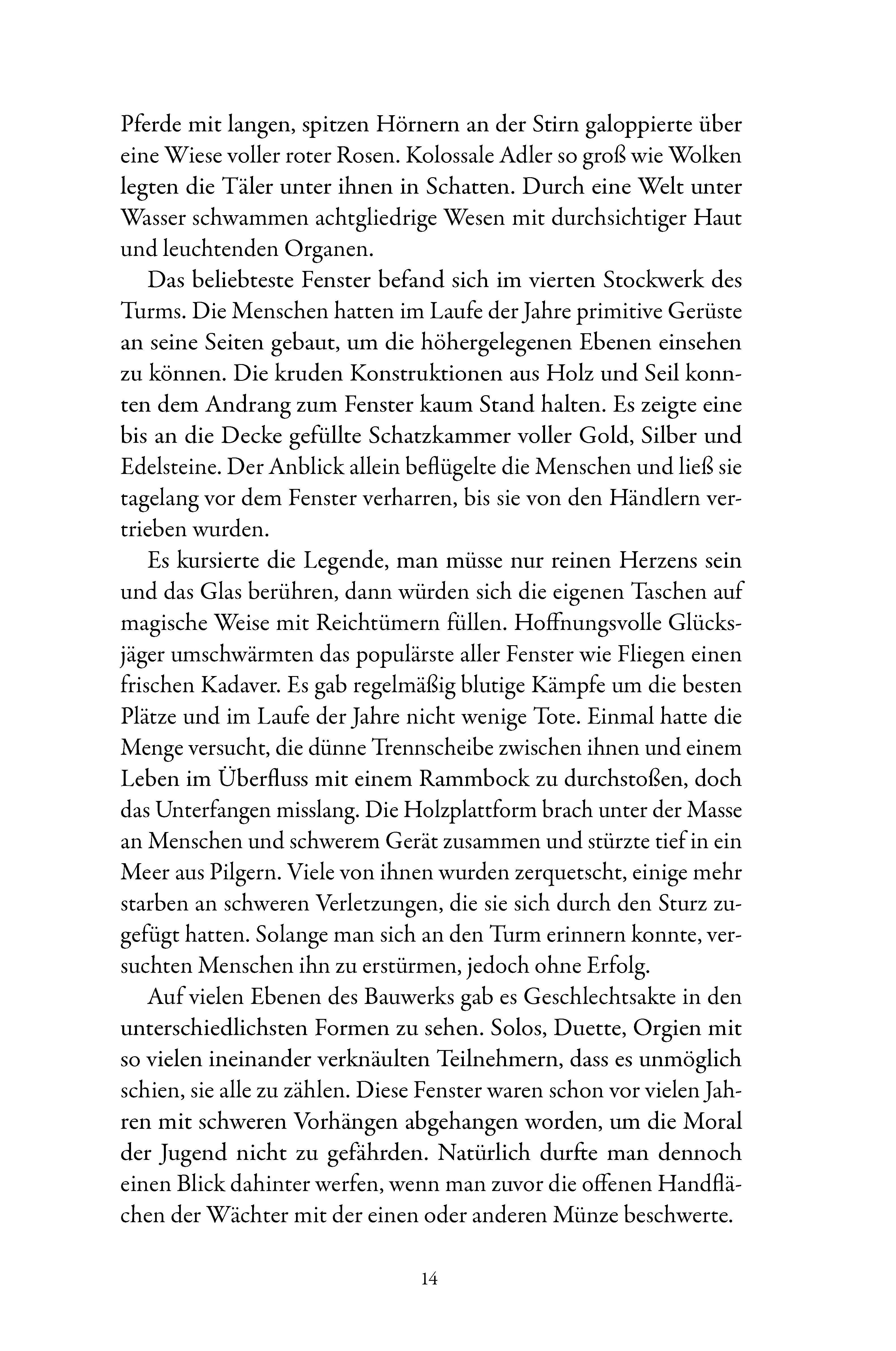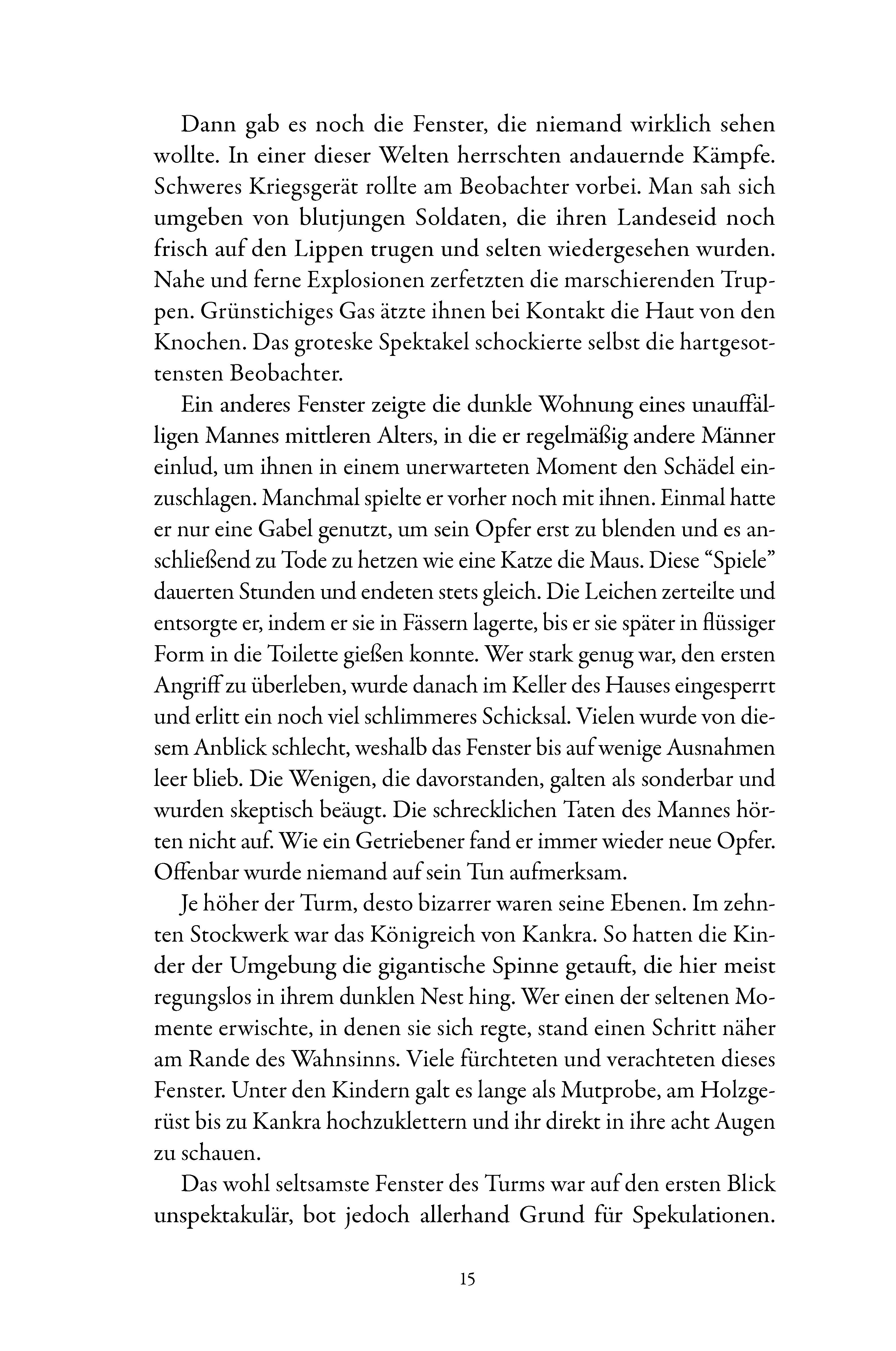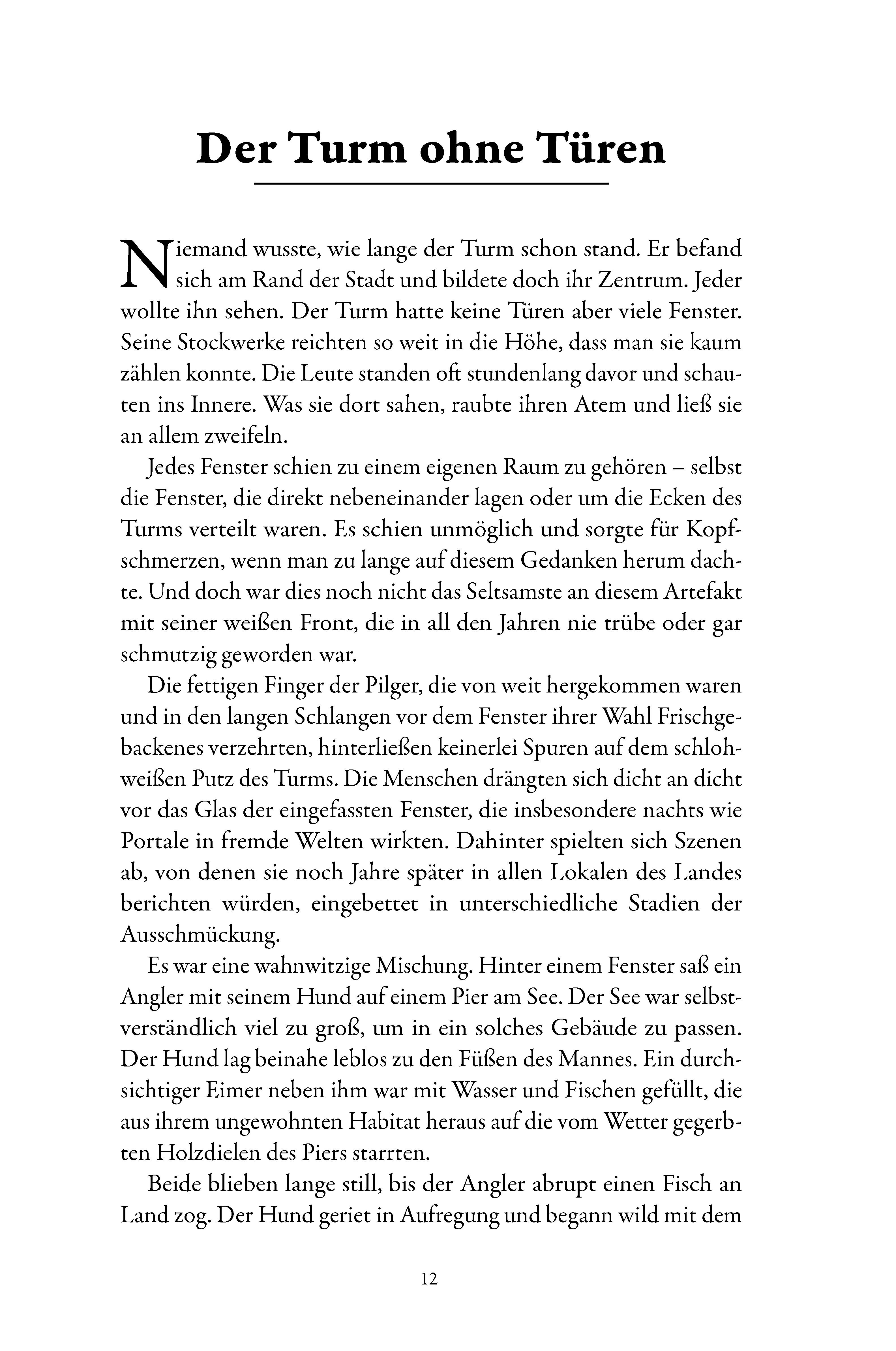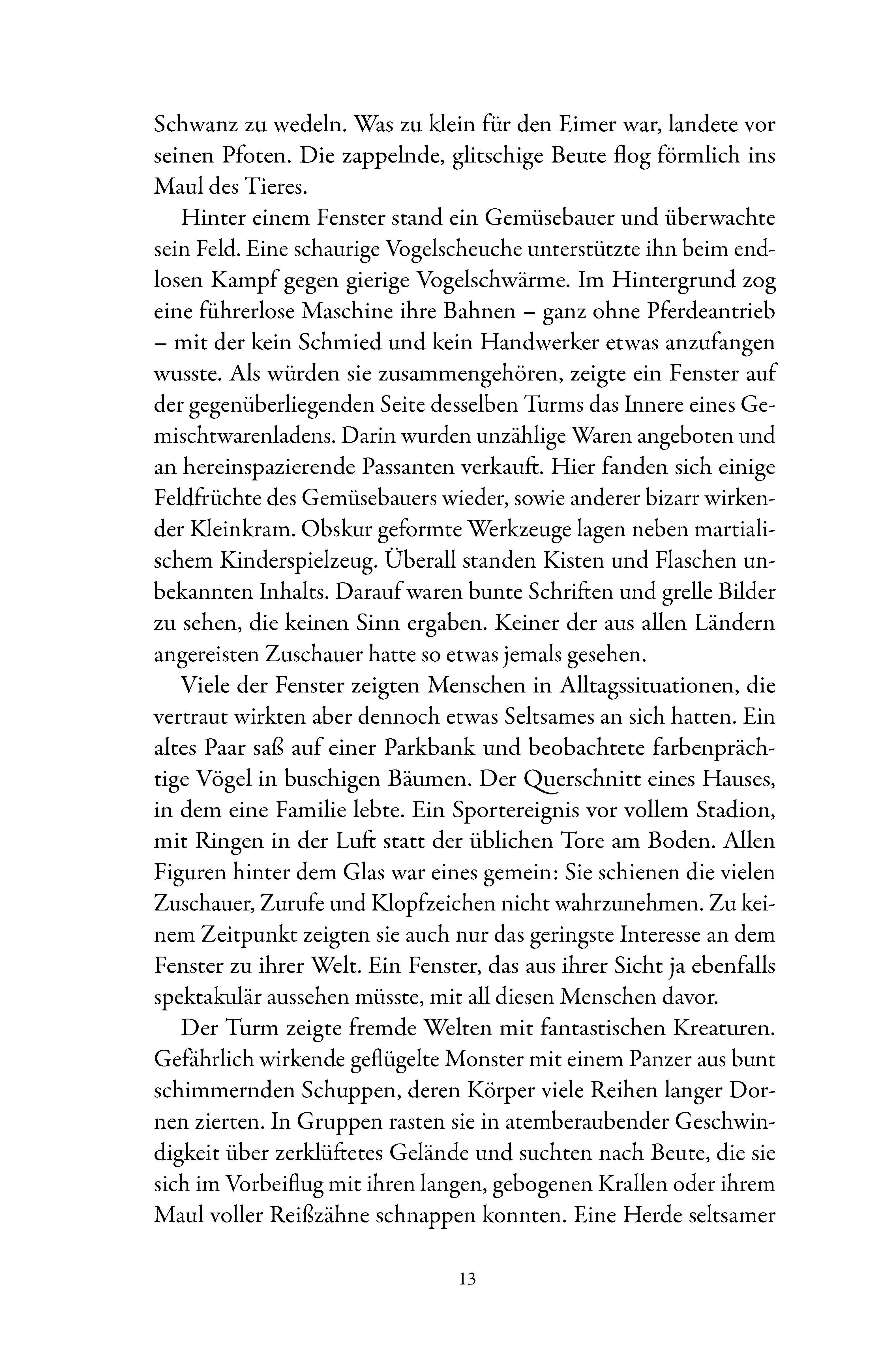 Ein bizarrer Turm zeigt fremde Welten und zieht die Betrachter in seinen Bann. Kurz vor der Katastrophe rettet sich die Menschheit ins All, doch was wird aus denen, die zurückbleiben? In einer dystopischen Metropole wagt eine einsame Frau den riskanten Schritt...