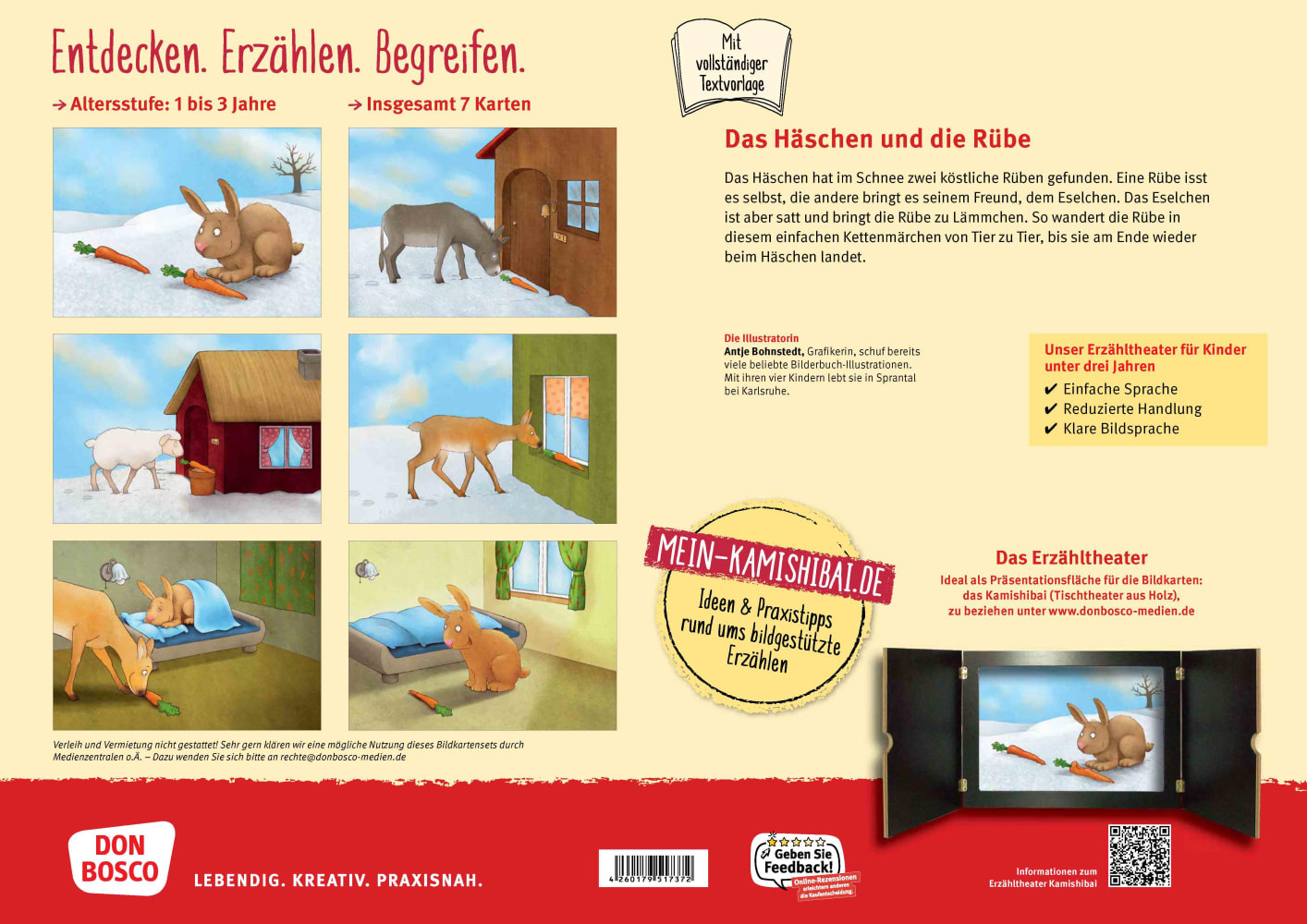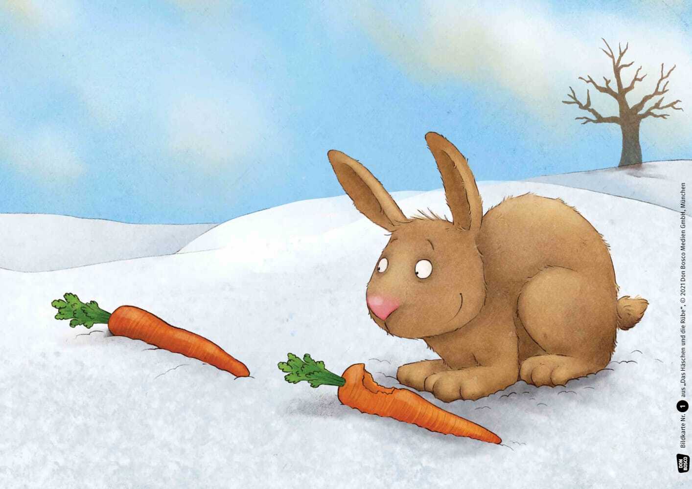 Bildkarten für das Erzähltheater: Das Märchen vom Häschen und der Rübe für Krippenkinder in einfacher Sprache und mit reduzierter Handlung. Das Wintermärchen vom Häschen und der Rübe für Krippenkinder erzählt Das kleine Häschen geht im tiefen Schnee auf Futter...