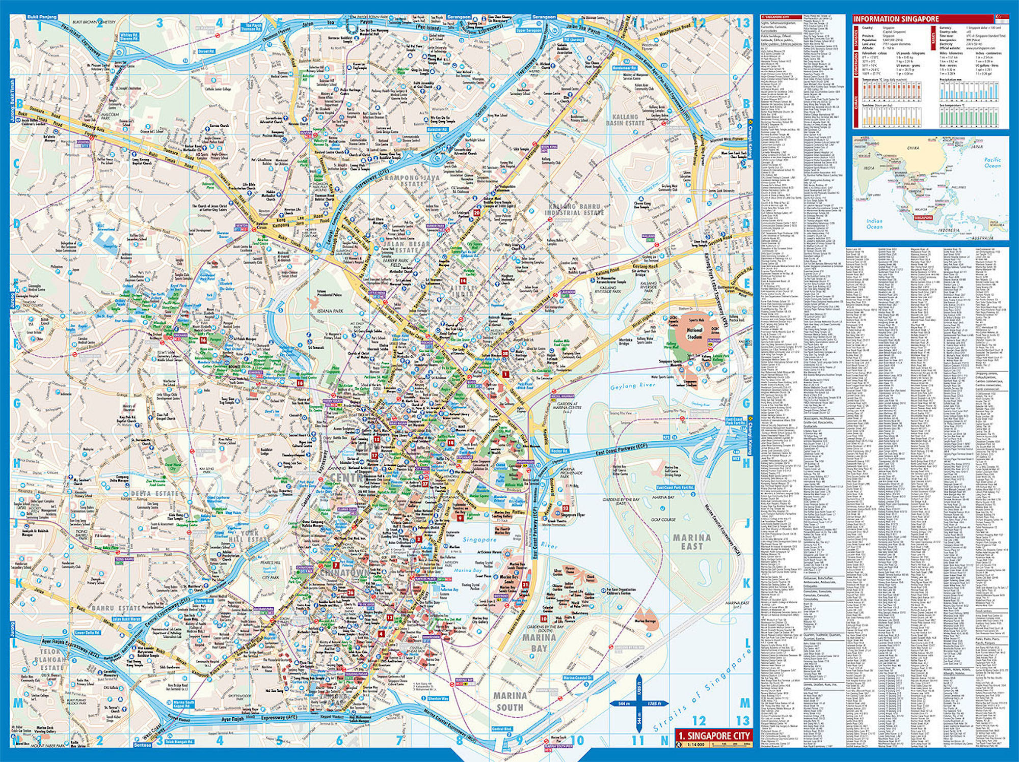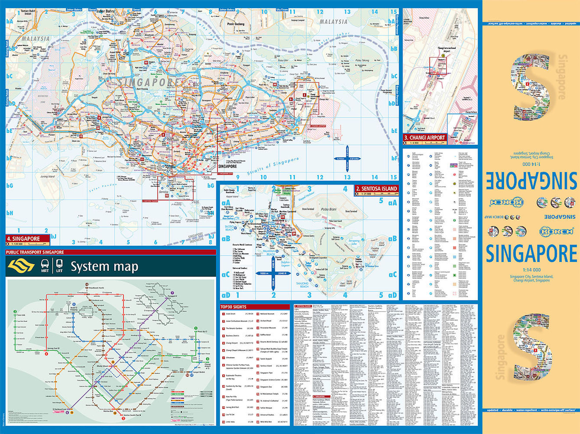 Our laminated and folded Borch Map of Singpore in the 2nd edition contains: Singapore City 1:14 000, Singapore 1:120 000, Sentosa Island 1:25 000, Changi Airport 1:4 000, the MRT and LRT public transport systems and an administrative map of Southeast Asia and ...