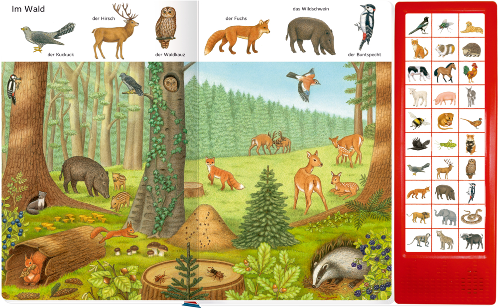 Bilder suchen-Wörter finden: So viele Tierstimmen (Soundb.) Das ist der Specht. Er macht tock, tock. Das ist das Wildschwein und es macht grunz, grunz. Aber wo ist der Hirsch? Und wie hört er sich an? 30 Tierabbildungen können benannt und in den großen Bildern...