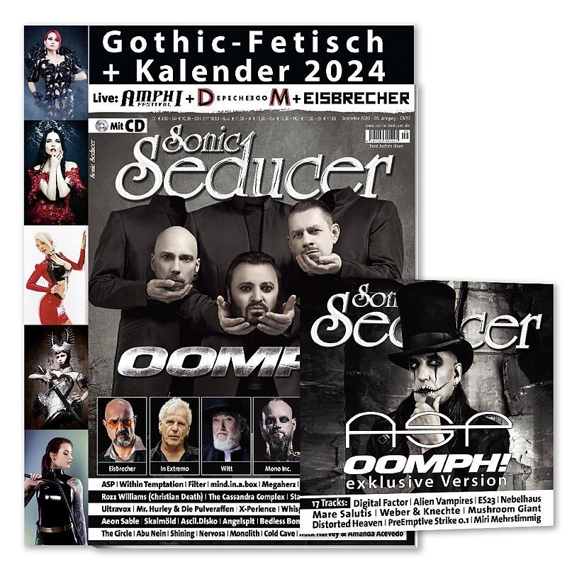 Alle Jahre wieder Erwartet Dich in unserer September-Ausgabe als besondere Beilage unser Gothic-Fetisch-Kalender 2024! Auch dieses Jahr freuen wir uns, wieder zahlreiche düstere und sexy Models präsentieren zu können und wünschen Dir damit viel Vergnügen! +++ ...Alle Jahre wieder Erwartet Dich in unserer September-Ausgabe als besondere Beilage unser Gothic-Fetisch-Kalender 2024! Auch dieses Jahr freuen wir uns, wieder zahlreiche düstere und sexy Models präsentieren zu können und wünschen Dir damit viel Vergnügen! +++ Bei OOMPH! stehen alle Zeichen auf Neuanfang. Neues Album, neuer Sänger, neue Motivation. Neben unserer großen, umfangreichen Titelstory findest Du auch eine exklusive Version des Tracks Wut auf unserem beiliegenden CD-Sampler. +++ Apropos Sampler: Dessen Cover ziert diesmal niemand Geringer als ASP, der mit Fürst der Finsternis nicht nur einen Track beisteuert, sondern uns im intimen Interview auch spannende Einblicke in sein neues Release gewährt. +++ Joachim Witt unser Fels in der Brandung spricht mit uns nicht nur über sein neues Album, sondern zeigt uns, dass er mit 74 Jahren sogar noch sein Unwesen auf TikTok treibt und natürlich noch vieles mehr. +++ Da fröstelt es gewaltig und dass im Hochsommer: Eisbrecher haben ihre Werkschau Es bleibt kalt! im Gepäck! Obendrauf spendieren wir noch einen Live-Bericht mit vielen tollen Bildern. +++ Auf den Bühnen ging es in den letzten Wochen aber nicht nur bei Eisbrecher ordentlich ab. Wir waren auf dem Amphi Festival, besuchten die Show von Depeche Mode in Berlin und genossen das Volle Kraft Voraus-Festival. Viel Spaß bei unseren Impressionen! OOMPH! Die erste Überraschung über den neuen OOMPH!-Sänger DER SCHULZ und die Single sind verdaut, nun geht es ans Eingemachte. Die Veröffentlichung des neuen Albums Richter und Henker steht unmittelbar bevor und uns hat natürlich brennend interessiert, wie FLUX, CR4P und DER SCHULZ zusammengefunden haben, wie die Zusammenarbeit im Studio lief, wie ihr Verhältnis zu Dero heutzutage ist, was die anderen Unzucht-Musiker über die neue Band ihres Sängers sagen und was uns die neue Platte inhaltlich beschert. In unserem ausführlichen Gespräch mit dem Trio konnten wir diesen und weiteren Fragen auf den Grund gehen. Obendrauf gibt es auf unserem Sampler den Track Wut in der exklusiven OOMPH! only-Version. ASP In der Rückschau war es für Frontmann Asp eine ganz schön ruckelige Zeit: Verschobene und nachgeholte Tourtermine und das Abschütteln des Pandemiekaters, der der ganzen Branche schwer auf dem Brustkorb saß. Doch die besondere Geschichte des Gothic-Novel-Rock-Acts ASP ist noch längst nicht fertig geschrieben und so erscheint am 9. September 2023 nun endlich Horrors A Collection Of Gothic Novellas, bei dem der Sänger und Songwriter nicht nur tief in die dunkelsten Ecken schauriger Erzählungen späht, sondern auch musikalisch Gefilde auslotet, die ASPs Wagemut und Spielfreude markant unterstreichen. ASP ziert diesmal außerdem unseren CD-Sampler und steuert darauf mit Fürst der Finsternis einen famosen Track bei. Joachim Witt Zu Zeiten der Neuen Deutschen Welle Goldener Reiter und Herbergsvater, beim Comeback mit der Werkreihe Bayreuth selbsternannter linker Kosmopolit und im Rahmen der Rübezahl-Trilogie rauschebärtiger, gütiger Berggeist: Seit mehr als 40 Jahren ist Joachim Witt Der Fels in der Brandung der deutschen Musiklandschaft. Überfällig also, dass sein neues Album, das am 15. September erscheint, ebendiesen Titel trägt. Der 74-Jährige gibt sich darauf weniger von dunklem Metal und Gothic geprägt als auf den Vorgängern, schickt mit Schwör mir eine sehnsuchtsvolle Ballade voraus und duettiert bei In unserer Zeit gar mit Schlager-Ikone Marianne Rosenberg. Was das Ganze mit Nino de Angelo, TikTok und, ja doch, Florian Silbereisen zu tun hat, verrät uns Joachim im Interview. Eisbrecher Für alle Eisbrecher-Fans gibt es diesmal die volle Ladung! Wenn Mr. Cool an sich, Alexander Alexx Wesselsky zum Interview gebeten wird, gibt es bekanntlich einzig Klartext, darauf sollte man gründlich vorbereitet sein. So hält sich der kehlen- und wortstarke Eismann auch diesmal wieder alles andere als zurück, wenn es darum geht, die neue Veröffentlichung gesprächig auf Zielkurs zu bringen. Schließlich gibt es eine inhaltsreiche Jubiläums-Werkschau: Es bleibt kalt! (2003-2023). Außerdem findet ihr viele Live-Bilder und einen Stage-Bericht ihrer Show in Hannover. Natürlich waren wir auch beim Volle Kraft Voraus Festival! Amphi Festival 2023 Auf seiner nunmehr 17. Auflage spielt das Szene-Großereignis auf dem Rheinpark-Gelände seine Stärken mal wieder sämtlich aus. Selbst phasenweise suboptimale Wetterbedingungen können da kaum ein Wässerchen trüben. Denn von Beginn an dominiert jene ausgesprochen entspannte Festivalstimmung, der das Amphi seinen besonderen Ruf verdankt. Allein die Vielzahl der sich aneinanderreihenden Highlights im Programm kann da für den ein oder anderen Stressfaktor zur Verantwortung gezogen werden. Doch eine weitgehend reibungslos funktionierende Organisation sowie das von Vater Rhein geprägte Ambiente sorgen dafür, dass trotz der stets anstehenden Qual der Wahl die Endorphine in Feierlaune geraten. Die volle Ladung Electro Allen Liebhabern der elektronischen Genres möchten wir diese Ausgabe besonders ans Herz legen. Mit dabei sind Interviews mit: Abu Nein, Angelspit, Bedless Bones, The Breath Of Life, The Cassandra Complex, Lore, Milicent, Mind.In.A.Box, Mono No Aware, Monolith, Johnny Tupolev, Ultravox, Unitcode:Machine u.v.m. Die volle Breitseite Rock & Metal Auch für Fans (goth)rockiger, post-punkiger und metallischer Klänge hat diese Ausgabe viel zu bieten. Wir führten unter anderem Interviews mit The Circle, Alice Cooper, Distorted Heaven, Dymna Lotva, Filter, Finsterforst, Kataklysm, Hexvessel, Nocte Obducta, Shining oder Within Temptation, um nur eine Handvoll dieser Perlen zu nennen. Außerdem gibt es u.a. fol