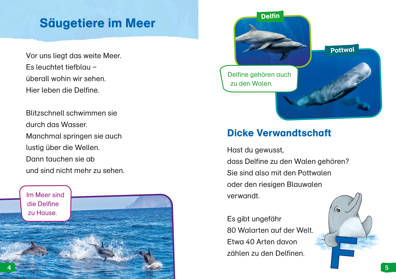 Sie gleiten pfeilschnell dahin und springen meterhoch über Wellen: Delfine sind beeindruckend gute Schwimmer. Doch wie atmen die Tiere? Wie kommen Delfinbabys auf die Welt und was sind Delfinschulen? Das können Leseanfängerinnen mit diesem Buch für die Lesestu...