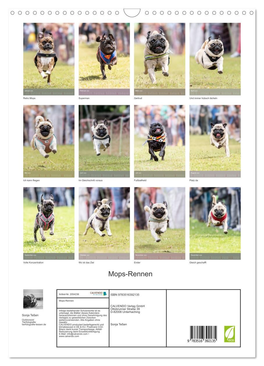 Auch Möpse können manchmal fliegen. Die Tierfotografin Sonja Teßen stellte aus Ihren Fotografien eines lokalen Mops-Rennens 12 ausgefallene Bilder für diesen Kalender zusammen. Entdecken Sie die sportliche Seite dieser Hunderasse. Es werden sowohl reinrassige ...