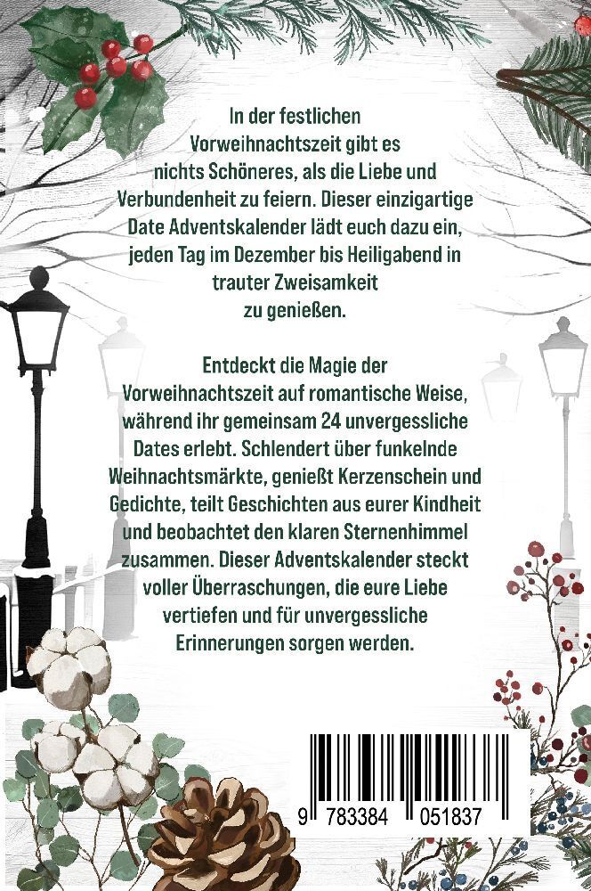Weihnachtszauber für zwei Taucht ein in die festliche Zauberwelt der Vorweihnachtszeit und lasst eure Liebe in diesem einzigartigen Date Adventskalender für Paare erblühen. Dieses Buch ist mehr als nur eine Sammlung von Ideen; es ist euer Weg, die Magie der Fe...