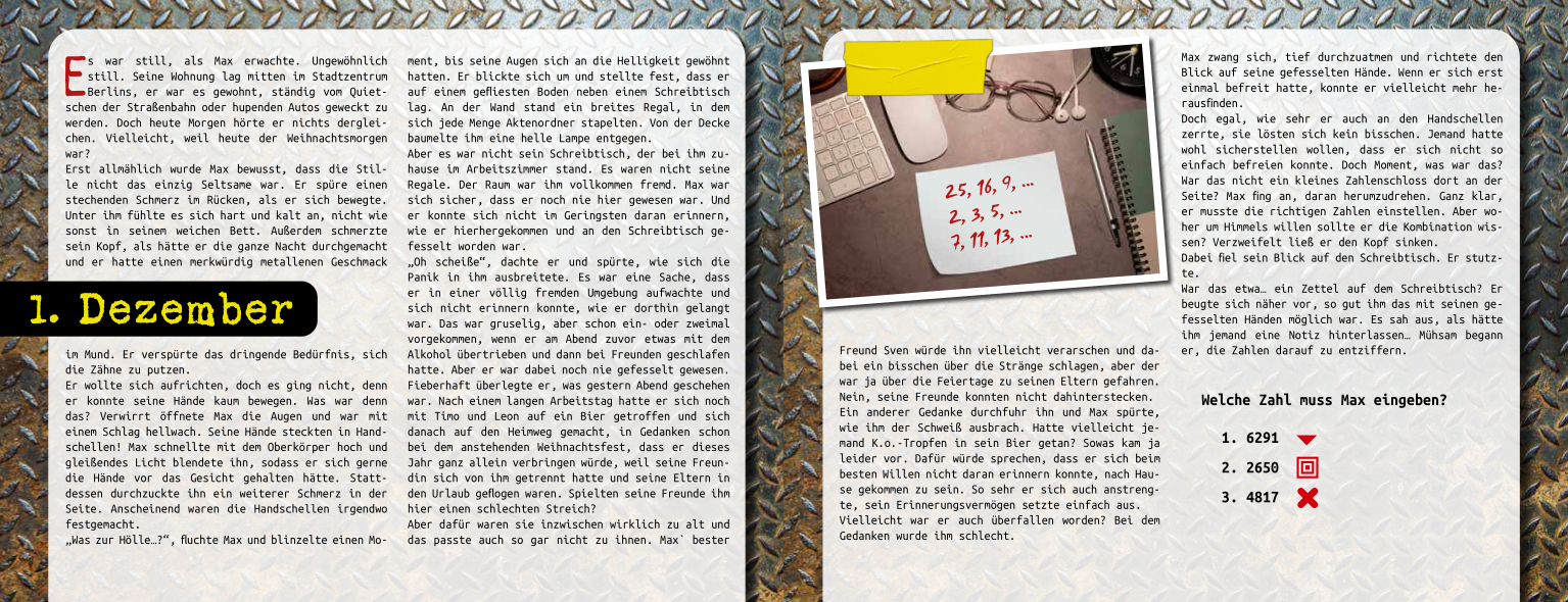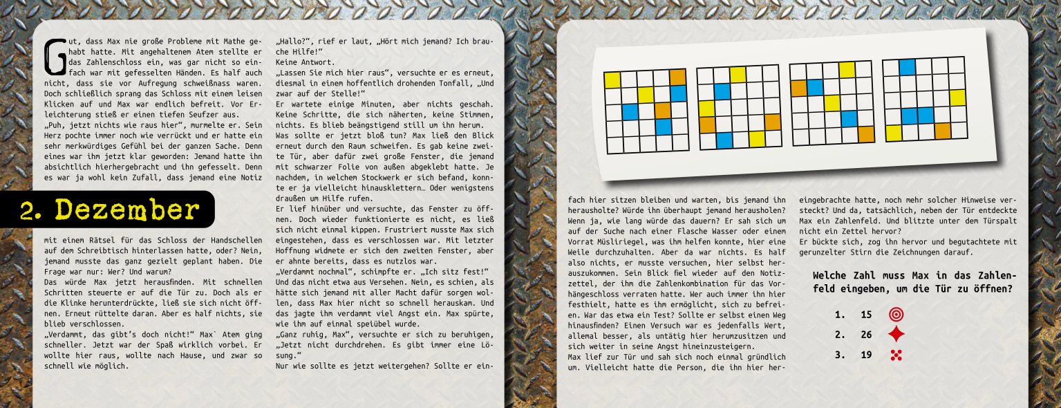 Ein Escape-Adventskalender für Rätselfans. In 24 Kapiteln wird die spannende Escape Room Story erzählt: Max erwacht kurz vor Weihnachten in einer leerstehenden Fabrik, ohne zu wissen, wie er dorthin gekommen ist. Eine Lautsprecherstimme teilt ihm mit, dass er ...