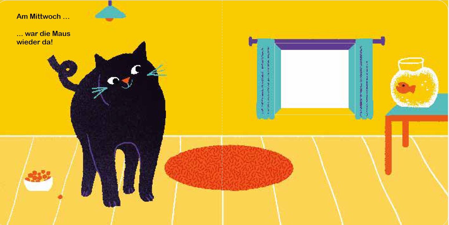Am Montag sieht die Katze die Maus zum ersten Mal am Fenster vorbeigehen. Am Dienstag trägt die Maus ein Bonbon und eine Tüte Mehl auf dem Kopf. Was führt sie wohl im Schilde? Erst am Sonntag lüftet sich das Geheimnis. Die Maus hat eine Geburtstagstorte für di...