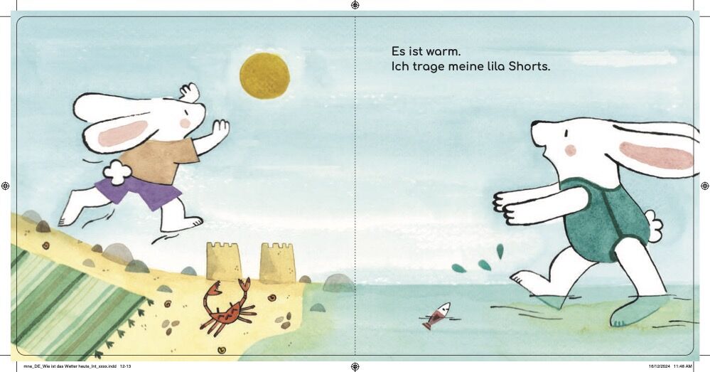 Der kleine Hase spielt gerne draußen. Wie ist das Wetter heute? Muss er seinen weißen Mantel anziehen? Seine roten Gummistiefel? Oder gar seine lila Badehose? Mit dem kleinen Hasen das Wetter entdecken. - Thema, das alle Eltern kennen: wie zieht man sich wette...