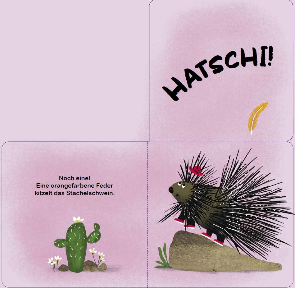 Eine gelbe Feder kommt geflogen und kitzelt das Zebra ... Hatschi! Da kommt eine rote Feder und kitzelt die Nase des Hundes ... Hatschi! Es werden immer mehr und alle Tiere müssen niesen. Aber woher kommen nur all die Federn? Ein interaktives Buch! Gemeinsames...