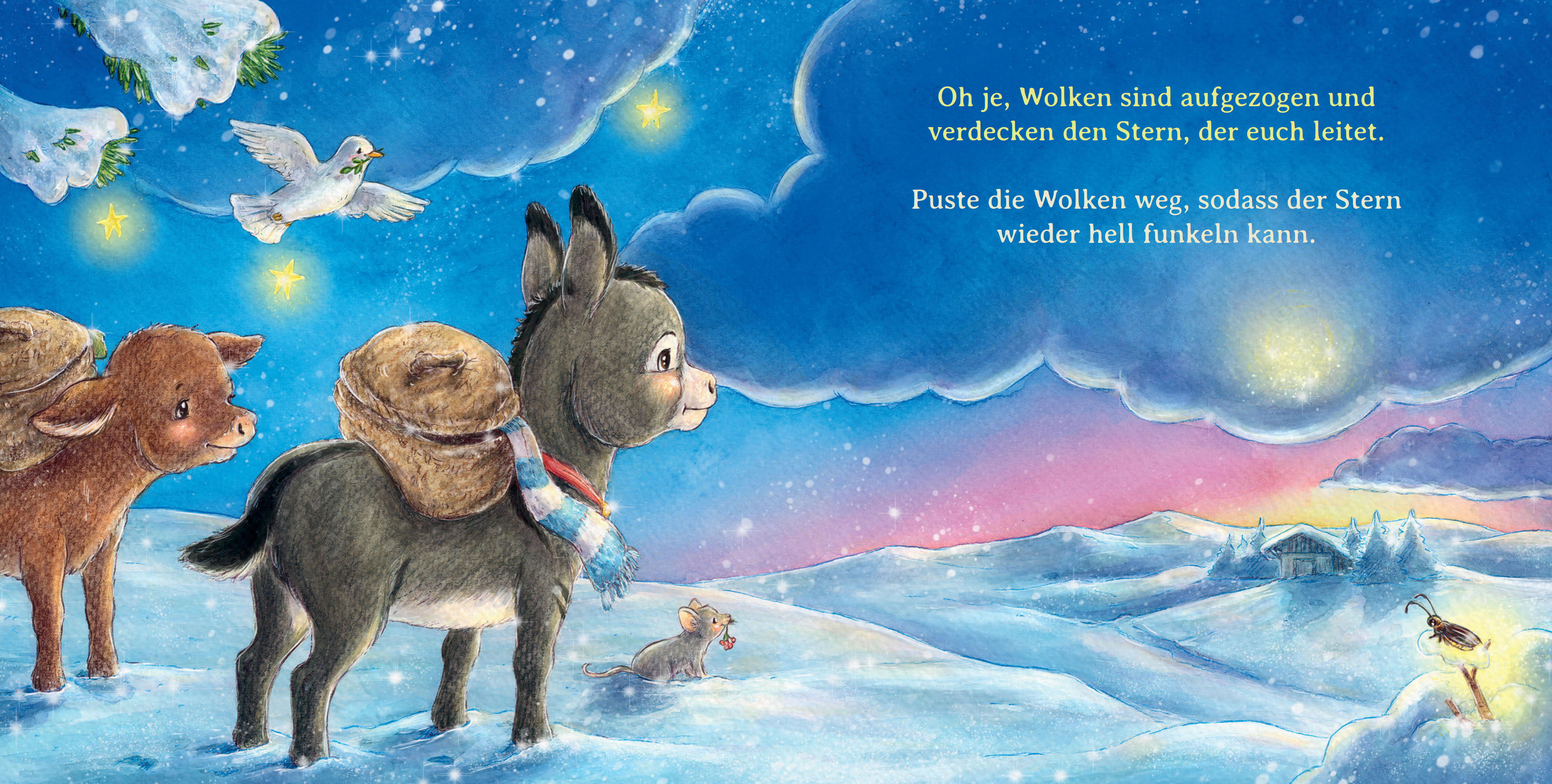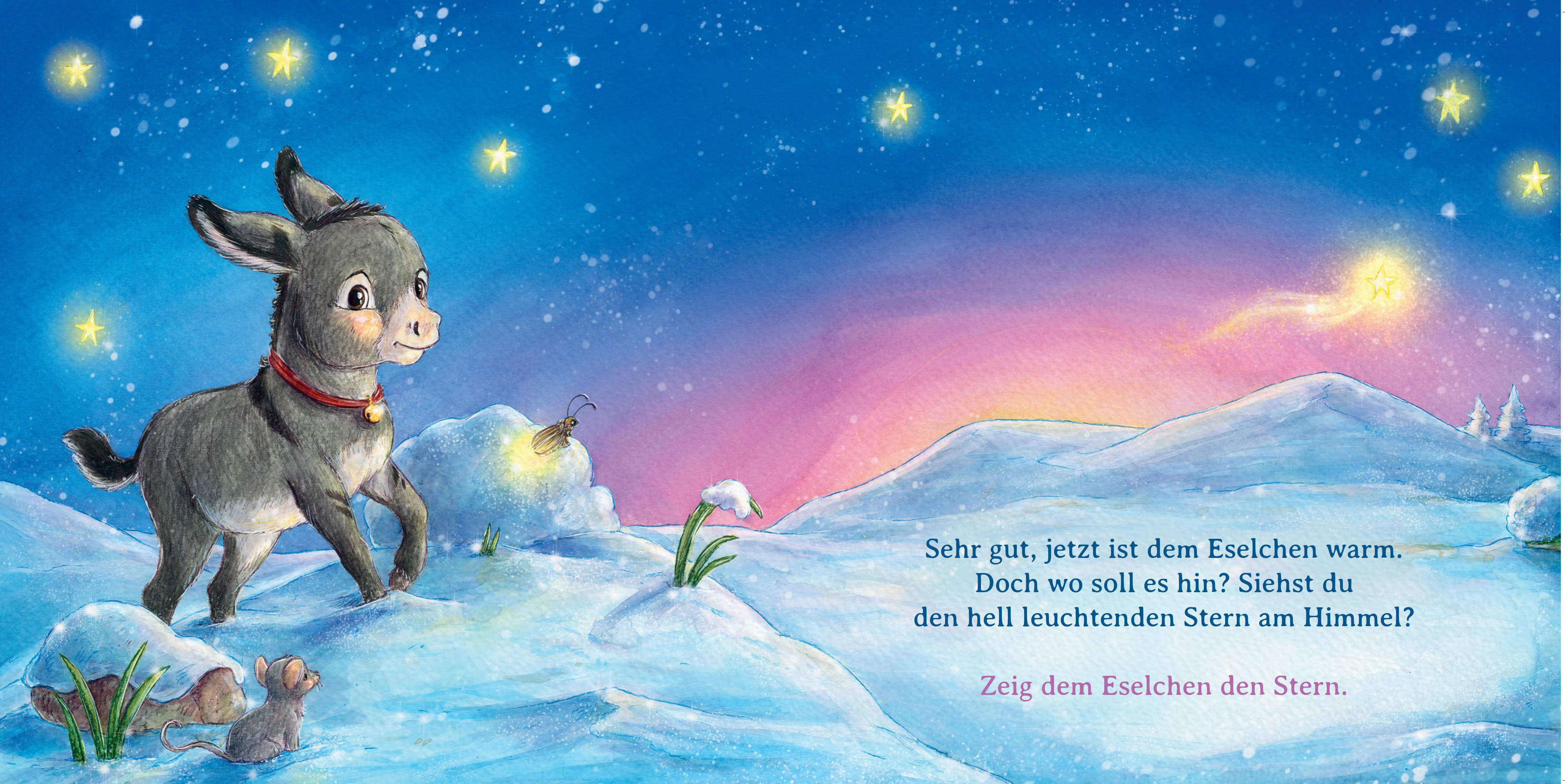 In einer kalten Winternacht leuchtet ein heller Stern am Himmel auf. Sieh nur, kleines Weihnachtseselchen! Dem Esel wird ganz warm ums Herz, als er den Stern entdeckt und ihr ihm gemeinsam folgt. Ermutige das Eselchen, weiterzugehen, als Wolken am Himmel aufz...