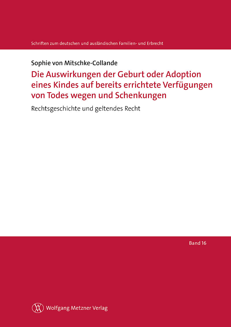 Gegenstand der Dissertation ist die rechtshistorische Aufarbeitung des Konflikts, der entsteht, wenn nach Errichtung eines Testaments, Abschluss eines Erbvertrages oder einer Schenkung dem Verfügenden ein Kind geboren wird. Beginnend mit dem römischen Recht w...Gegenstand der Dissertation ist die rechtshistorische Aufarbeitung des Konflikts, der entsteht, wenn nach Errichtung eines Testaments, Abschluss eines Erbvertrages oder einer Schenkung dem Verfügenden ein Kind geboren wird. Beginnend mit dem römischen Recht wird das gemeine sowie das preußische Recht auf die genannte Fragestellung hin untersucht. Anschließend rückt die Gesetzgebungsgeschichte zum Bürgerlichen Gesetzbuch (BGB) sowie deren Weiterentwicklung nach Inkrafttreten in den Fokus. Dabei wird stets über das Gebiet des Erbrechts hinaus auch das Schenkungsrecht in den Blick genommen.