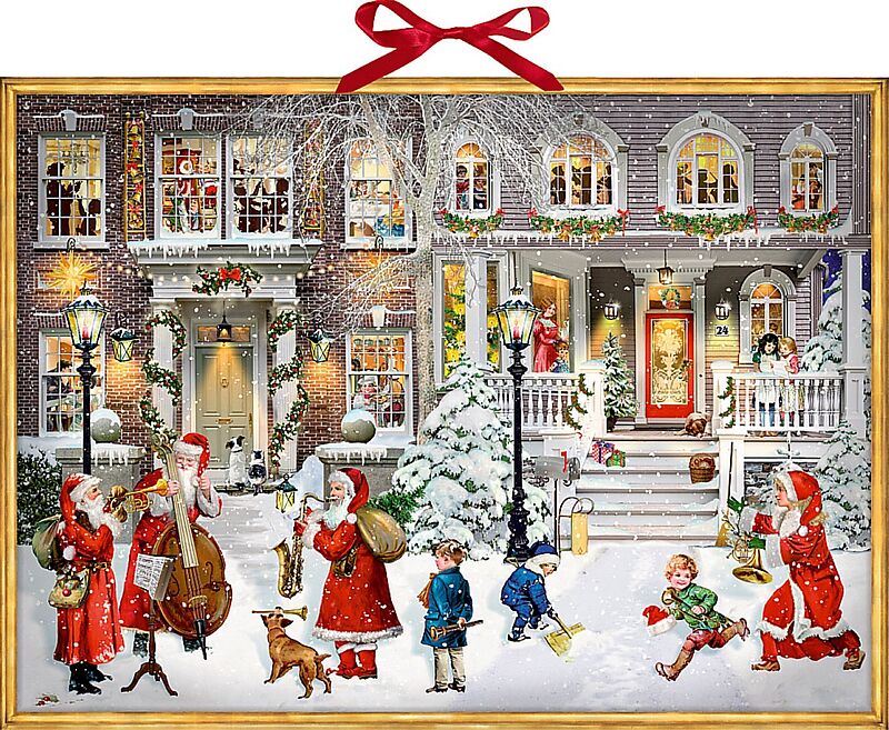 Marktneuheit: Großer Wand-Adventskalender mit 24 beschwingten Variationen internationaler Weihnachtssongs. Auf Knopfdruck erklingt jeden Tag ein instrumentales Weihnachtslied. Mit austauschbarer Batterie. Dünnes, unauffälliges Batteriefach. Mit 24 Verwandeltür...