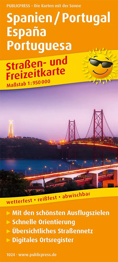 Straßen- und Freizeitkarte für Spanien und Portugal mit touristischen Straßen, Highlights der Region und Reisemobilstellplätzen. Schnelle Orientierung durch das übersichtliche Straßennetz. In bewährter PUBLICPRESS-Qualität: wetterfest, reißfest, beschrift