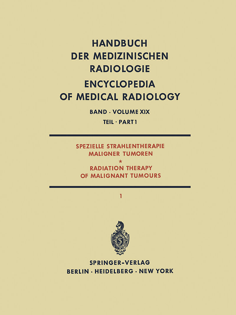 Contents.- A. Präcancerosen.- I. Die Präcancerosen der Haut.- II. Die Präcancerosen der Schleimhaut.- III. Präcancerosen der inneren Organe.- Literatur.- B. Haut.- I. Allgemeiner Teil.- II. Spezieller Teil: Röntgentherapie bösartiger Geschwülste.- Literatur.- III. Maligne Melanome.- Literatur.- C. Augenmalignome.- I. Einleitung.- II. Maligne Augenlid- und Augenwinkeltumoren.- III. Epibulbäre Tumoren.- IV. Intraoculare Tumoren.- V. Retrobulare und intraorbitale Tumoren.- Literatur.- D. Nasenhöhle und Nasennebenhöhlen.- Vorbemerkung.- I. Anatomie und Physiologie.- II. Vorkommen, Lokalisation und Art der Tumoren.- III. Symptomatologie, Diagnostik und Stadieneinteilung.- IV. Therapie.- V. Komplikationen infolge und nach Therapie.- VI. Prognose und Behandlungsergebnisse.- VII. Wahl des BehandlungsVerfahrens.- VIII. Zusammenfassung.- Literatur.- E. Oral cavity cancer.- I. Preamble.- II. Pathology.- III. Incidence.- IV. Aetiology.- V. Diagnosis.- VI. Differential diagnosis.- VII. Secondary lymph node involvement.- VIII. Clinical staging.- IX. Principles of treatment.- X. Treatment methods.- XI. Complications of treatment.- XII. Rare malignant tumours of the mouth.- XIII. Salivary tumours.- XIV. Results.- References.- F. Cancer of the lips.- I. Introduction.- II. Causative factors.- III. Pathological anatomy.- IV. Lymphatic drainage of the lip.- V. Distant metastases from lip cancer.- VI. Other tumours of the lip.- VII. Staging.- VIII. Treatment.- IX. Complications.- X. Surgical treatment of the primary lesions.- XI. Treatment of involved lymph nodes.- XII. Results.- References.- G. Die percutane Bestrahlung bei Lippengeschwülsten.- I. Historie.- II. Anatomie.- III. Klinik und Pathologie der Lippengeschwülste.- IV. Die Therapie.- V. Beurteilung derBestrahlungsmethoden.- VI. Nachsorge.- Literatur.- H. Große Speicheldrüsen.- I. Allgemeines.- II. Diagnose und Differentialdiagnose.- III. Histologische Klassifizierung.- IV. Behandlung.- V. Prognose.- Literatur.- J. Oesophagus.- I. Anatomie und Topographie des Oesophagus.- II. Pathologie und Histologie.- III. Ausdehnung des Oesophaguscarcinoms.- IV. Ausbreitung des Tumors.- V. Häufigkeit des Auftretens.- VI. Ort der Erkrankung.- VII. Erkrankungsalter und Verteilung auf die Geschlechter.- VIII. Anamnesendauer.- IX. Klinik des Oesophaguscarcinoms.- X. Diagnostische Untersuchungsmethoden.- XI. Stadieneinteilung.- XII. Behandlungsmethoden.- XIII. Dosierung.- XIV. Ergebnisse.- XV. Palliativer Bestrahlungseffekt.- XVI. Präoperative Bestrahlung.- XVII. Wert der Probeexcision.- XVIII. Problem der Gastrostomie.- XIX. Komplikationen nach der Bestrahlung und infolge des Tumorwachstums.- XX. Einfluß der Strahlen auf das Carcinom.- Literatur.- K. Magen, Dünndarm, Colon.- I. Tumoren des Magens.- II. Tumoren des Dünndarms.- III. Tumoren des Dickdarms.- Literatur.- L. Rectum.- I. Allgemeiner Teil.- II. Therapeutischer Teil.- Literatur.- M. Pankreas.- I. Einleitung.- II. Die wesentlichen anatomischen Daten über die Bauchspeicheldrüse.- III. Allgemeines über das primäre Pankreascarcinom.- IV. Das klinische Bild.- V. Therapie.- Literatur.- N. Leber.- I. Einleitung.- II. Verbreitung und Entstehungsbedingungen.- III. Pathologie und Histologie der Lebertumoren.- IV. Klinik der Lebertumoren.- V. Therapie.- Literatur.- O. Gallenblase und Gallenwege.- I. Allgemeines.- II. Das primäre Carcinom der Gallenblase.- III. Das primäre Carcinom der extrahepatischen Gallengänge.- Literatur.- Namenverzeichnis Author Index.