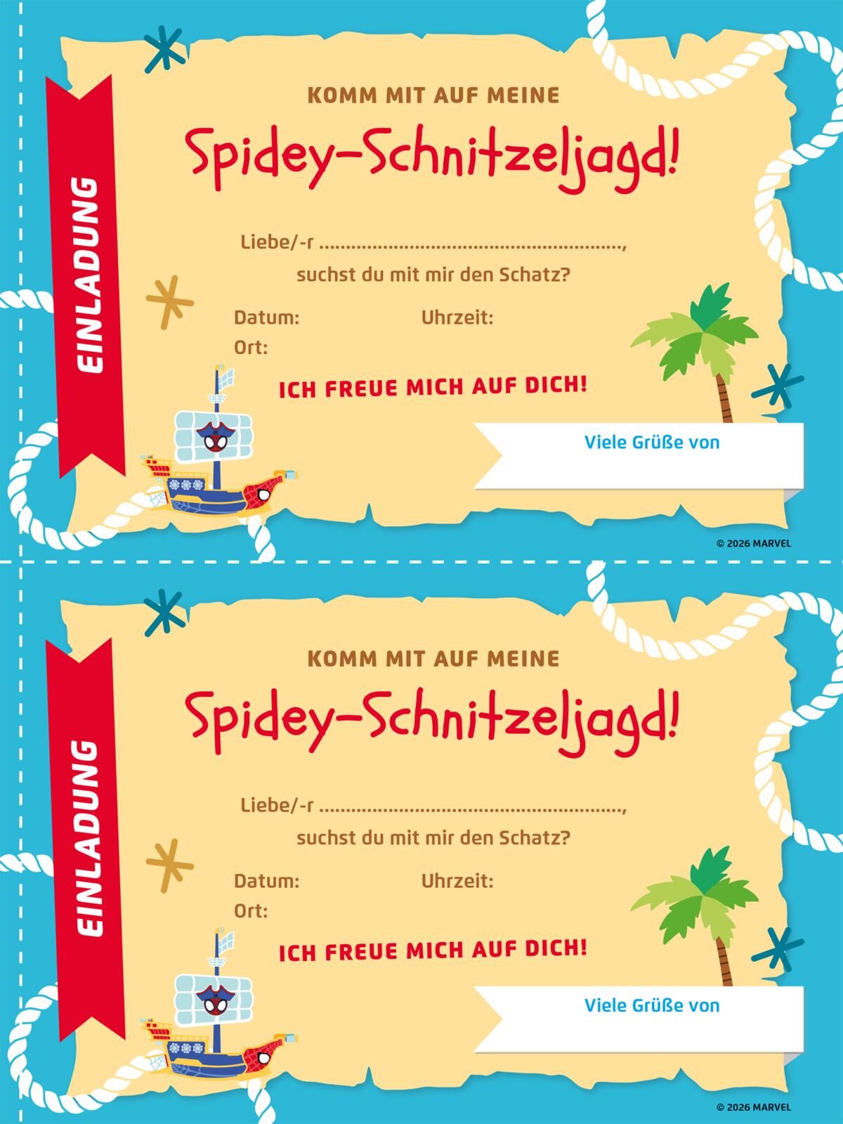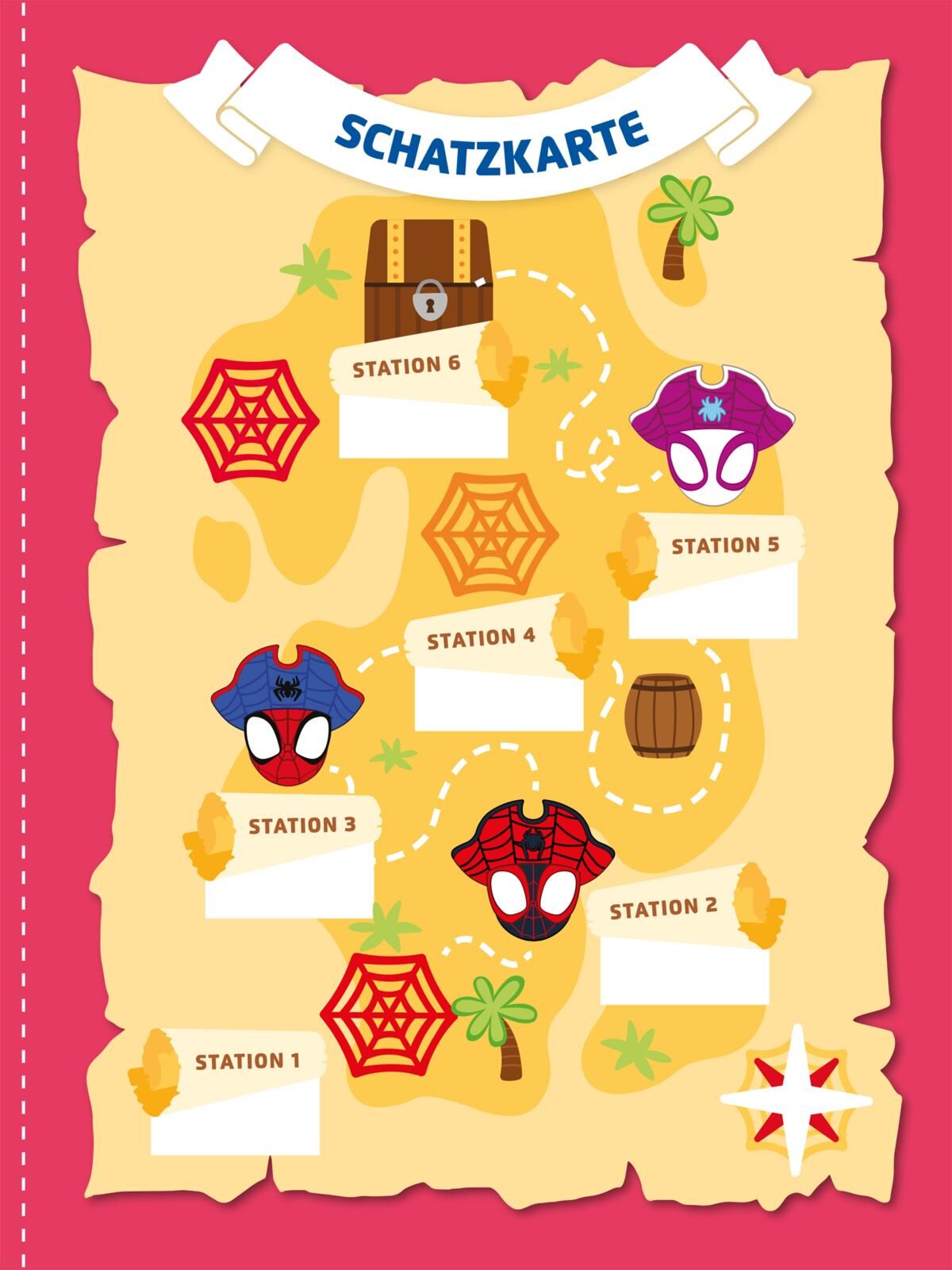 Auf Schatzsuche mit Spidey und seinen Super-Freunden! Mit Spidey eine geheime Botschaft entschlüsseln, Ghost-Spider bei einem rasanten Einsatz begleiten oder mit Spin ein kniffliges Rätsel lösen diese Schnitzeljagd sorgt für einen actionreichen Kindergeburtst...