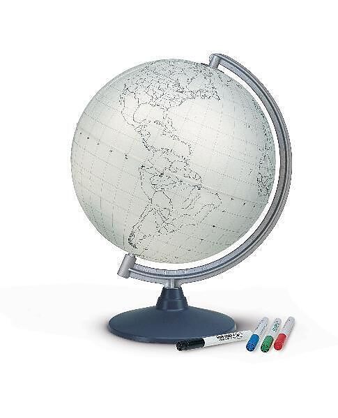 Stummer Globus, unbeleuchtet hellgrau, Durchm. 30 cm, mit Gradnetz u. Konturen ohne Text, bezeichen- u. abwaschbar, als Lehrmittel geeignet, mit 4 Farbstiften