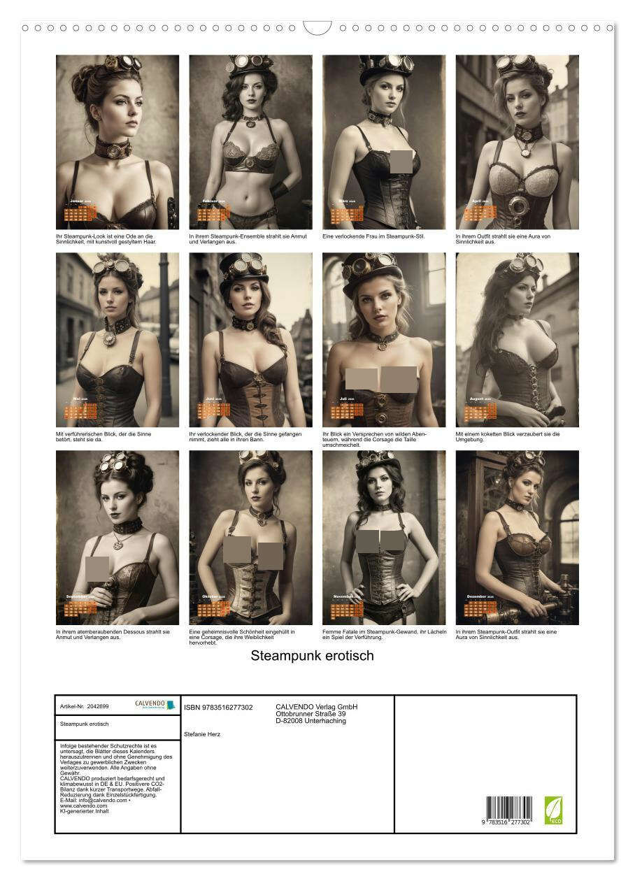 Tauche ein in eine faszinierende Welt, in der Eleganz auf Abenteuer trifft und Sinnlichkeit auf Maschinerie: Unser exklusiver Steampunk-Erotik Wandkalender lädt dich zu einer Reise durch zwölf atemberaubende KI-generierte Porträtfotos ein. Jeder Monat präsenti...