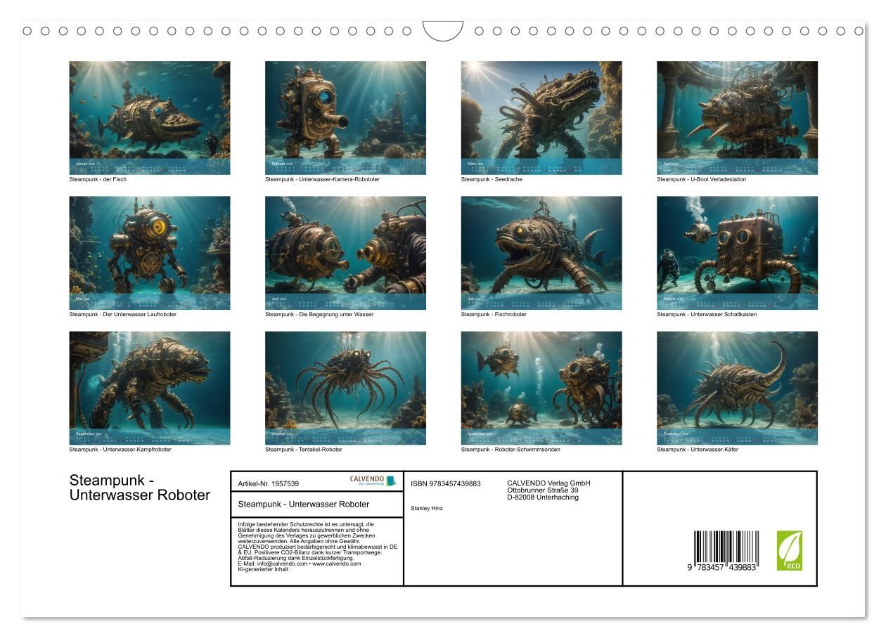 Willkommen in einer Welt voller Abenteuer und technologischer Meisterwerke - willkommen zu unserem Steampunk Unterwasser-Roboter-Wandkalender. In dieser einzigartigen Sammlung von zwölf atemberaubenden Bildern präsentieren wir Ihnen eine Vielzahl von Steampunk...