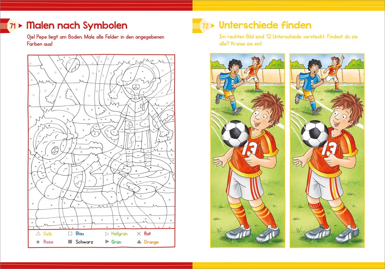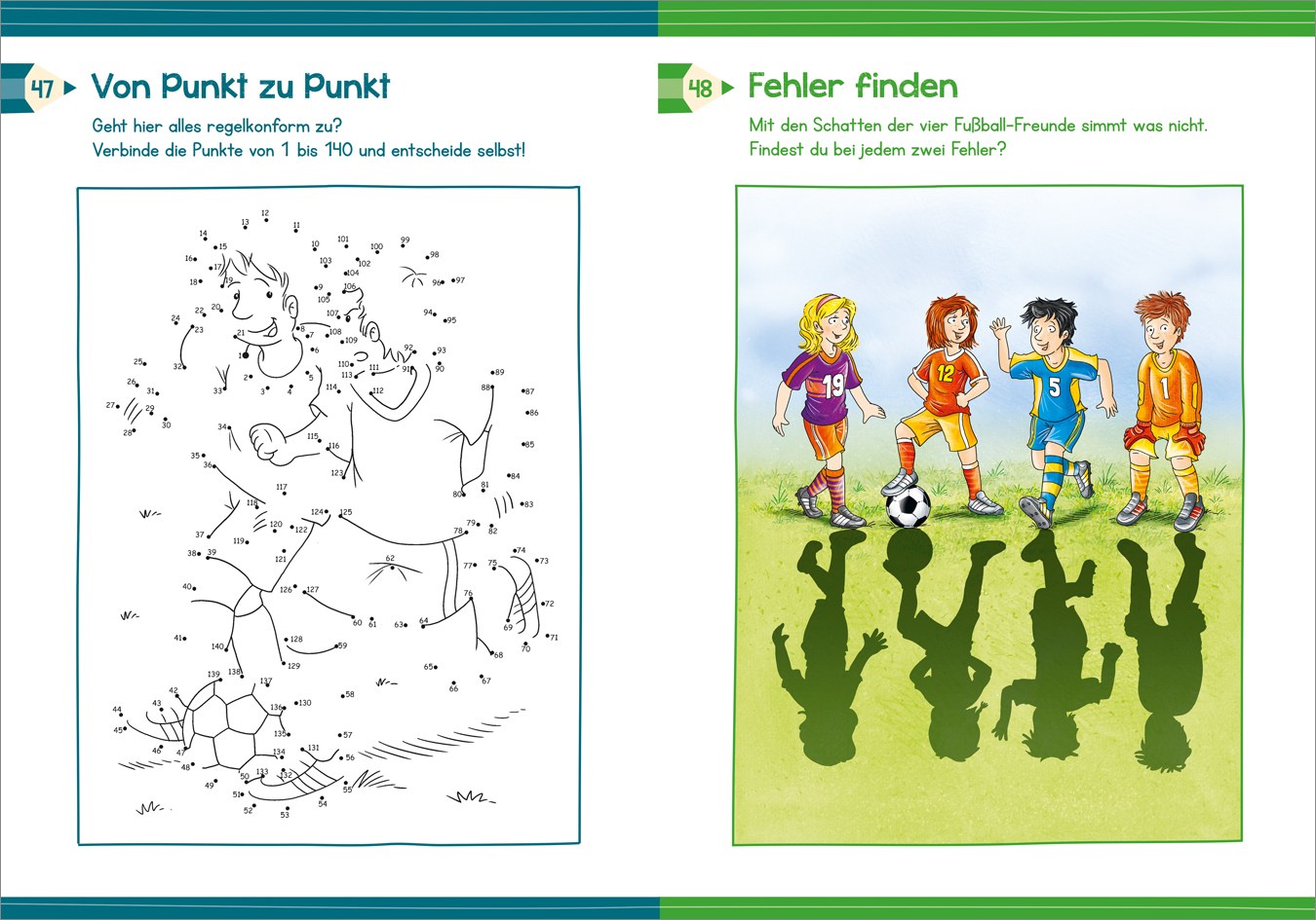 Spannende Fußballszenen von Punkt zu Punkt entstehen lassen, den Fußball durch das Labyrinth zum Tor dribbeln oder die Siegerfotos des Trainers auswerten dieser extradicke Mal- und Rätselspaß lässt die Herzen von Fußballfreunden ab 7 Jahren deutlich schneller ...