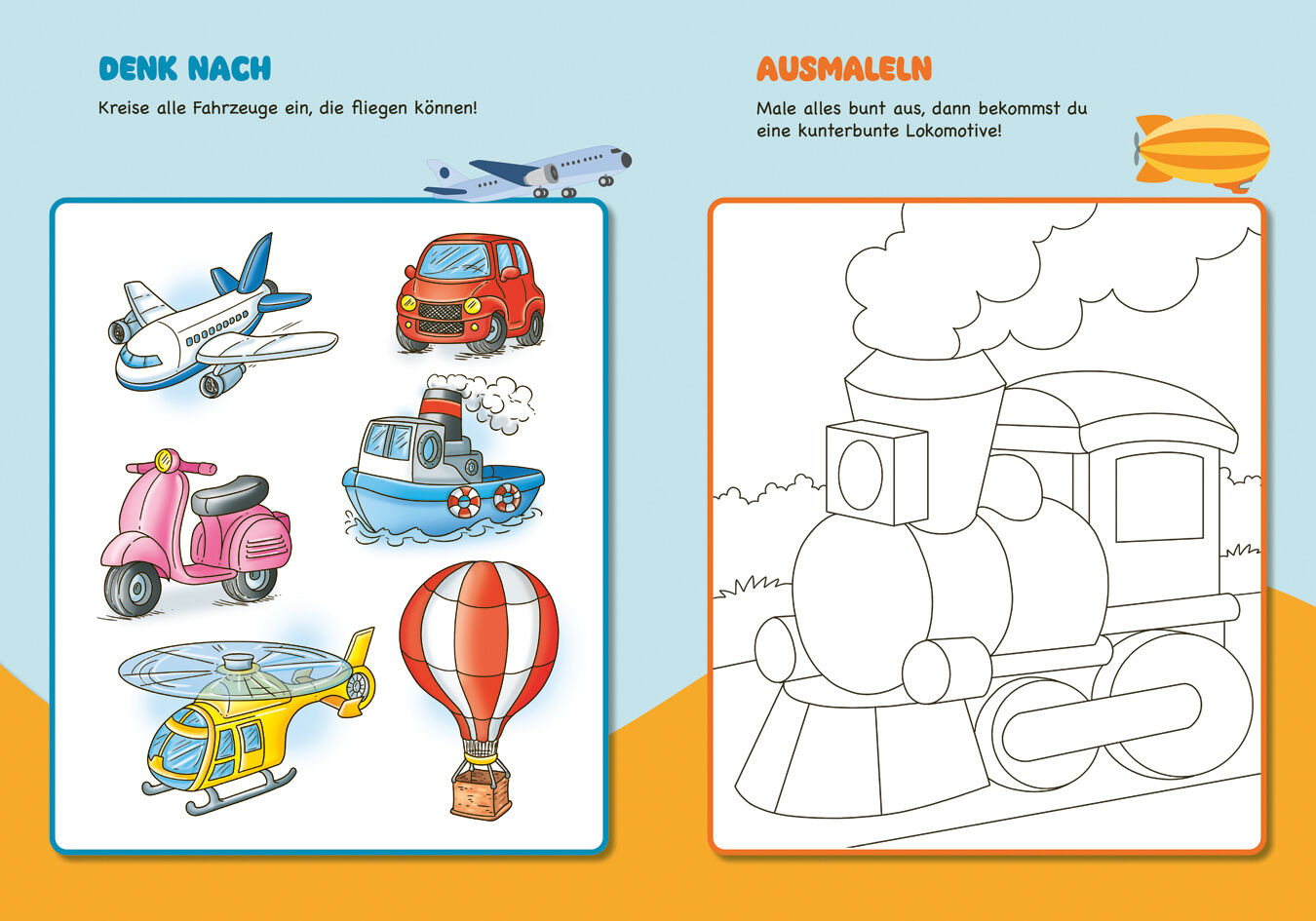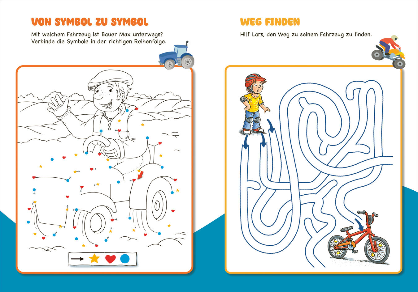 Traktor, Bagger, Rennauto: In diesem Mal- und Rätselheft dreht sich alles um Fahrzeuge. Da verbinden sich geheimnisvolle Symbole zu einem Polizeiauto und auf der Baustelle bei Kipplaster und Bagger haben sich fünf Fehler versteckt. Wie kann man Schritt für Sch...
