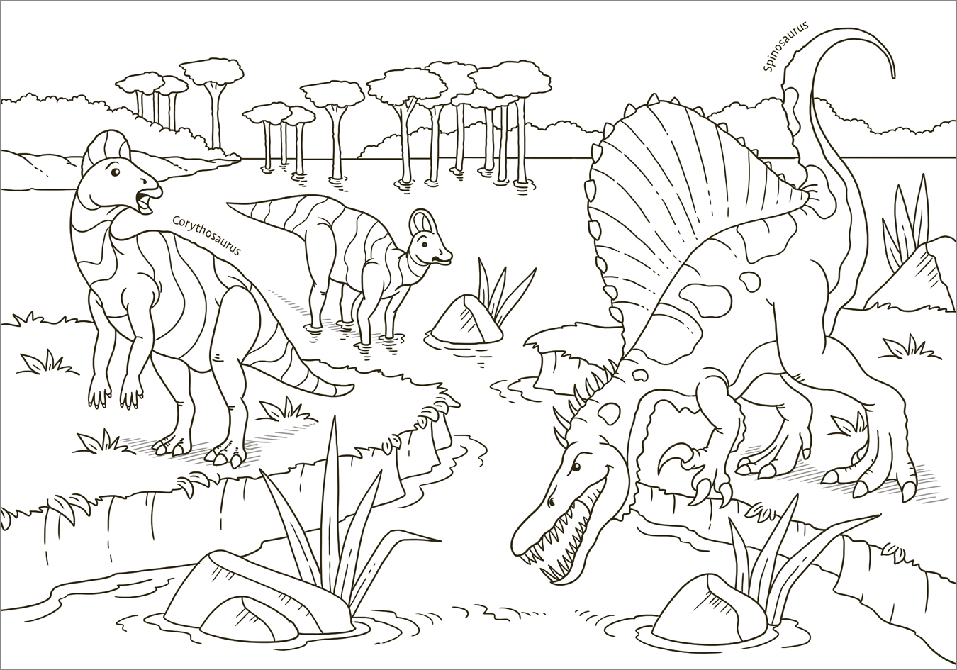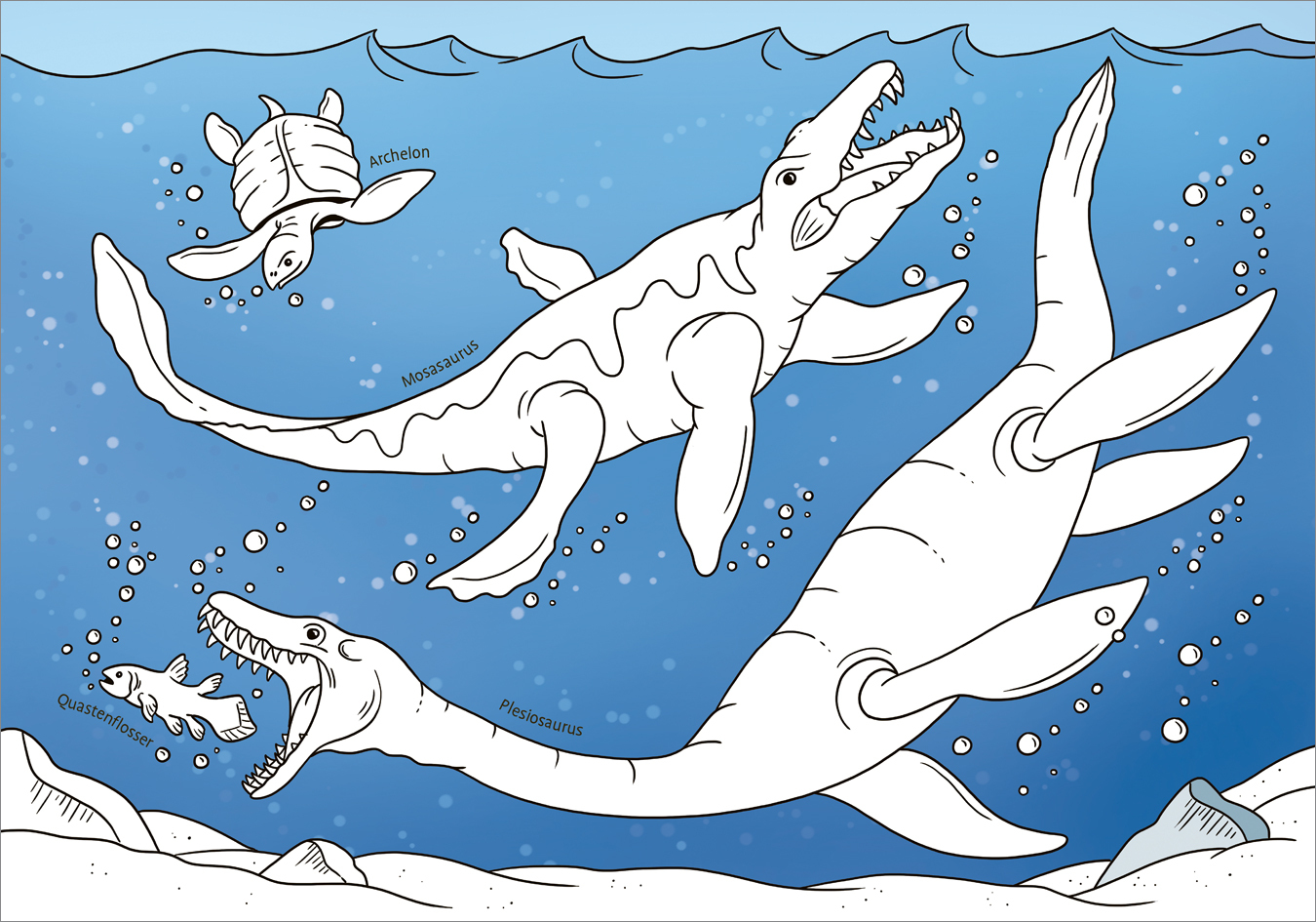 Kämpfende Pachycephalosaurier, ein jagender Dimorphodon, der brüllende Tyrannosaurus Rex oder auch der Unterwasser-Jäger Plesiosaurus zahlreiche Motive beliebter Dinosaurier und Meeressaurier liefern viel kreativen Ausmalstoff. Die meisten Motive erstrecken si...