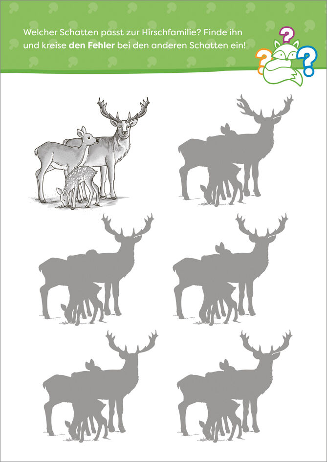 Welcher Schatten passt zum Hirschkäfer? Wie unterscheiden sich die Blätter einer Fichte von einer Buche? Welche Tiere sind nachtaktiv? Die vielen abwechslungsreichen, bunten und naturnahen Rätsel machen einfach Spaß! Buchstabenrätsel, Sudokus und Schattenrätse...