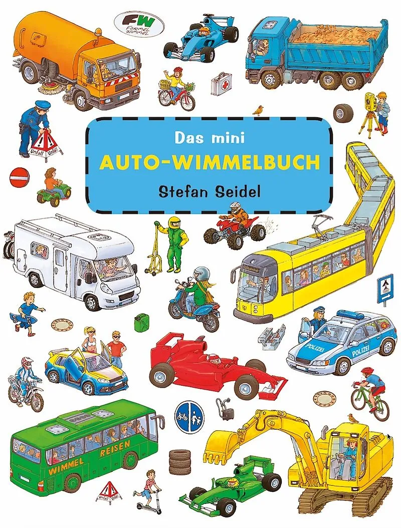Wo man nur hinguckt - im Autowimmelland passieren viele aufregende Dinge. Vor dem Autohaus werden gerade die neuen Sportwagen geliefert, der Rettungswagen muss zu einem Unfall auf der Autobahn, beim Autorennen kommt es zu einem besonders gewagten Überholmanöve...