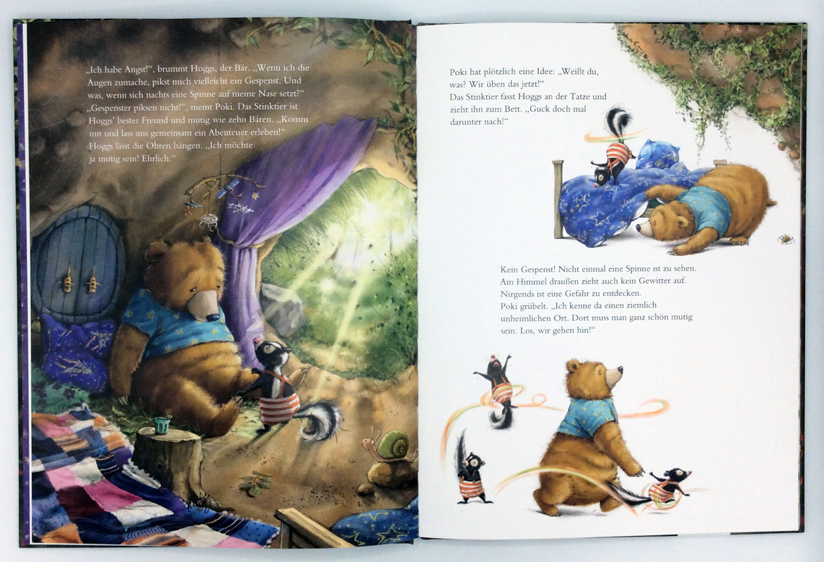 Ein Zauberwald zum Träumen schön mit Bilderbuch-Illustrationen vom Feinsten! Der Bär Hoggs wäre gerne mutig. Aber er fürchtet sich vor Spinnen und Gespenstern. Da beschließen Hoggs und sein bester Freund, das Stinktier Poki, das mit dem Abenteuer mal ein biss...