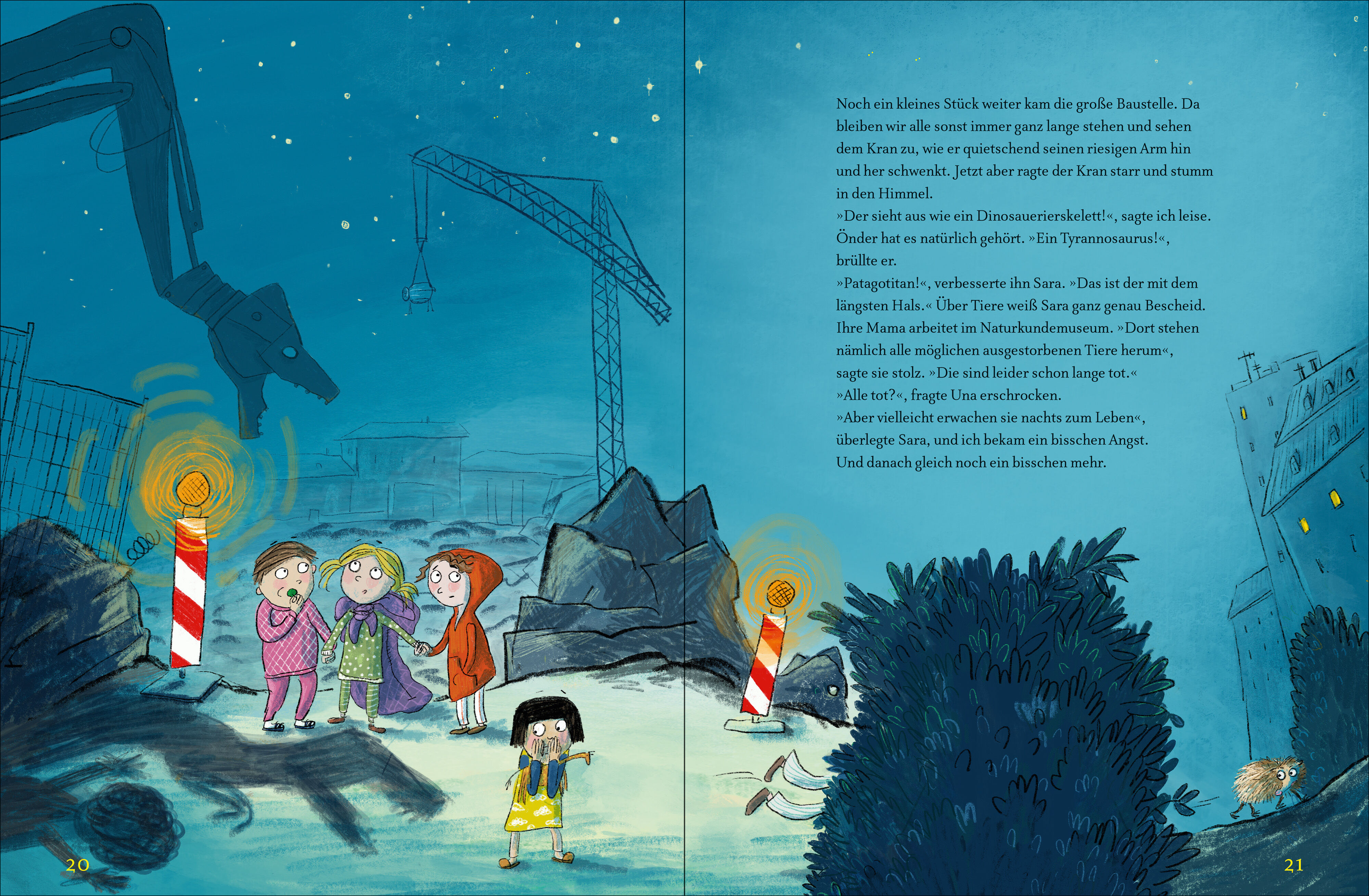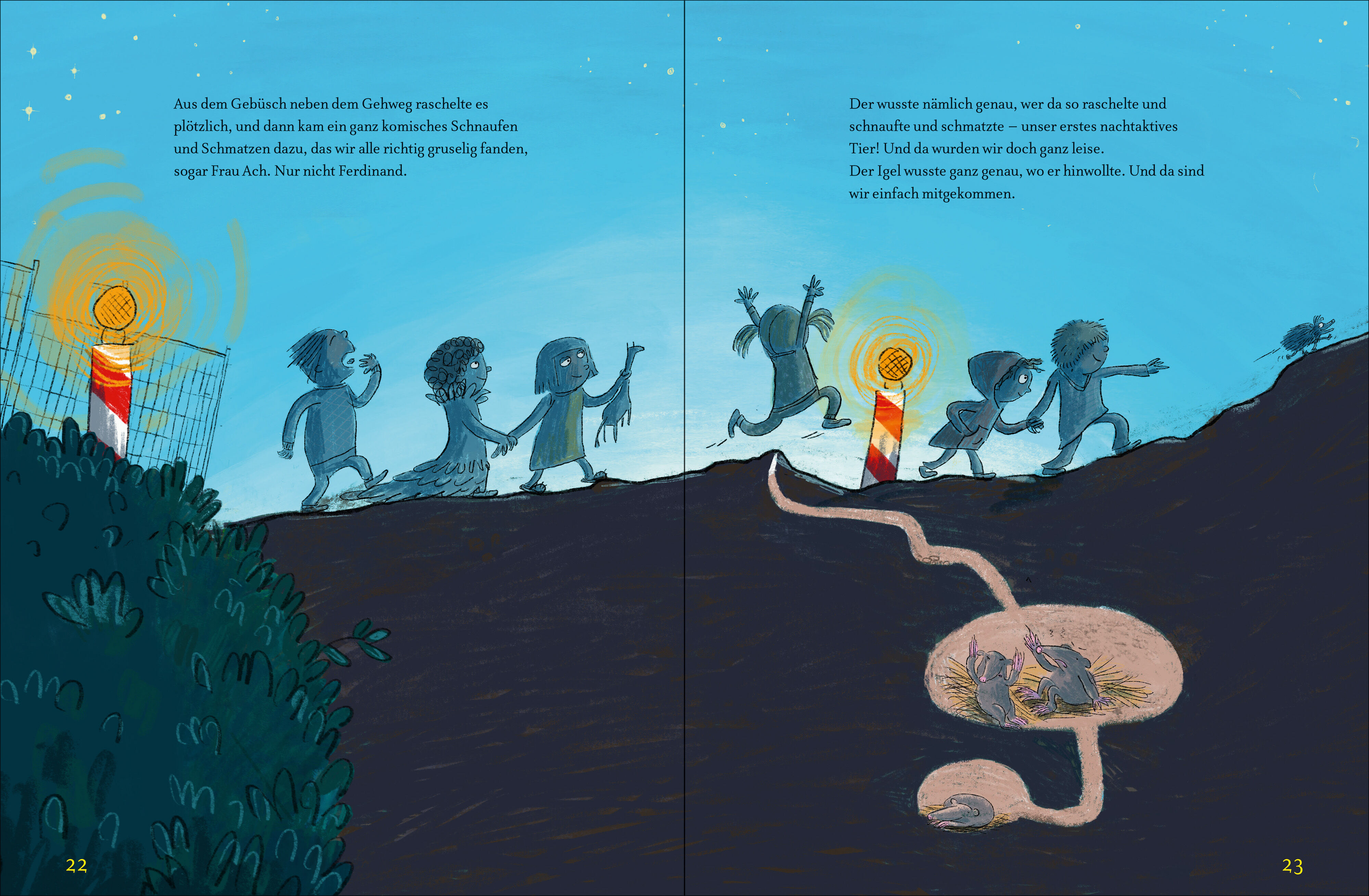 Juchuh, eine Übernachtung im Kindergarten! Weil das alles so aufregend ist, machen die Igelkinder erstmal einen kleinen Nachtspaziergang mit Kuscheltieren - und staunen: In der Nacht sehen Bagger aus wie Dinos, Schaukeln quietschen wie Vampire. Auf jeden Fall ...