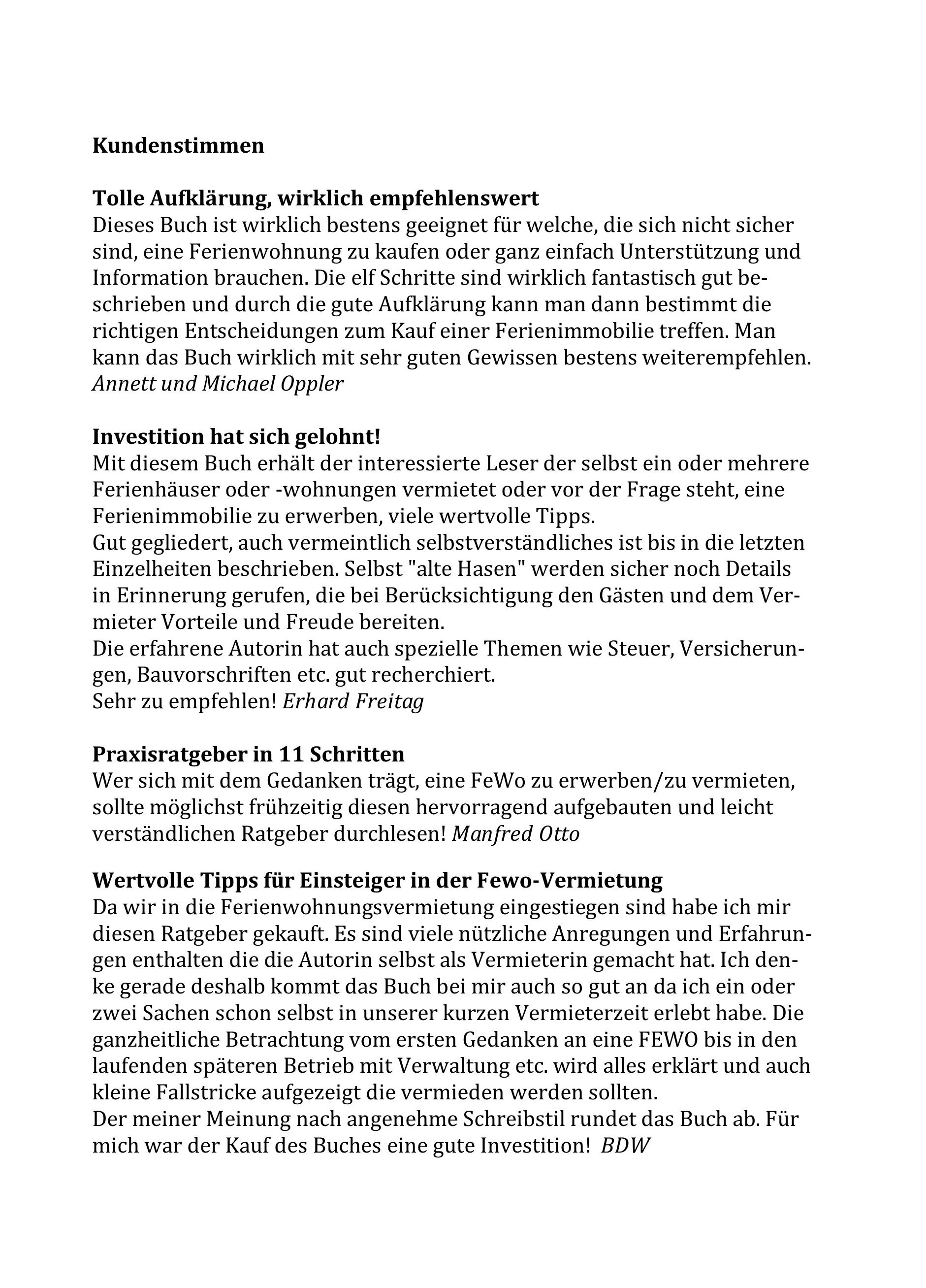 Ist eine Ferienimmobilie die richtige Kapitalanlage für Sie? Dieser Praxis-Ratgeber ist zugleich Entscheidungshilfe und Anleitung. Er zeigt Ihnen betriebswirtschaftlich und praktisch fundiert, wie Sie in elf Schritten zum erfolgreichen Vermieter einer Ferienim...
